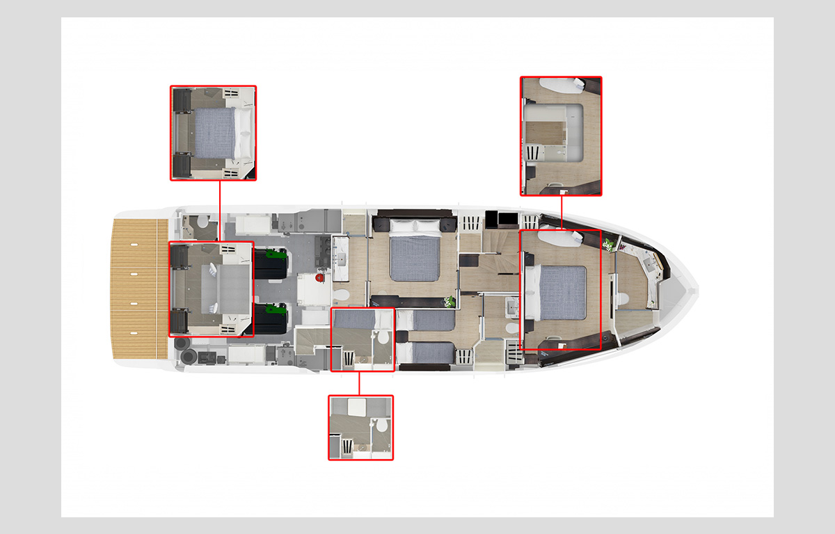 Beach Club by day and VIP cabin with an en-suite head by night: this alchemy is made possible thanks to the placing of the crew cabin—with 2 berths—directly accessible from the second starboard side door. A triumph of livability both at daytime and at night-time, right at the stern, right on the water!