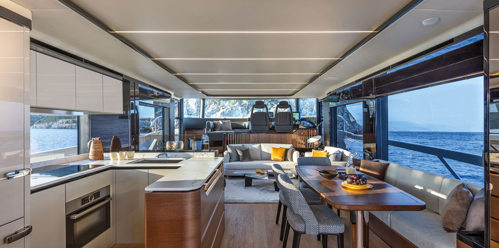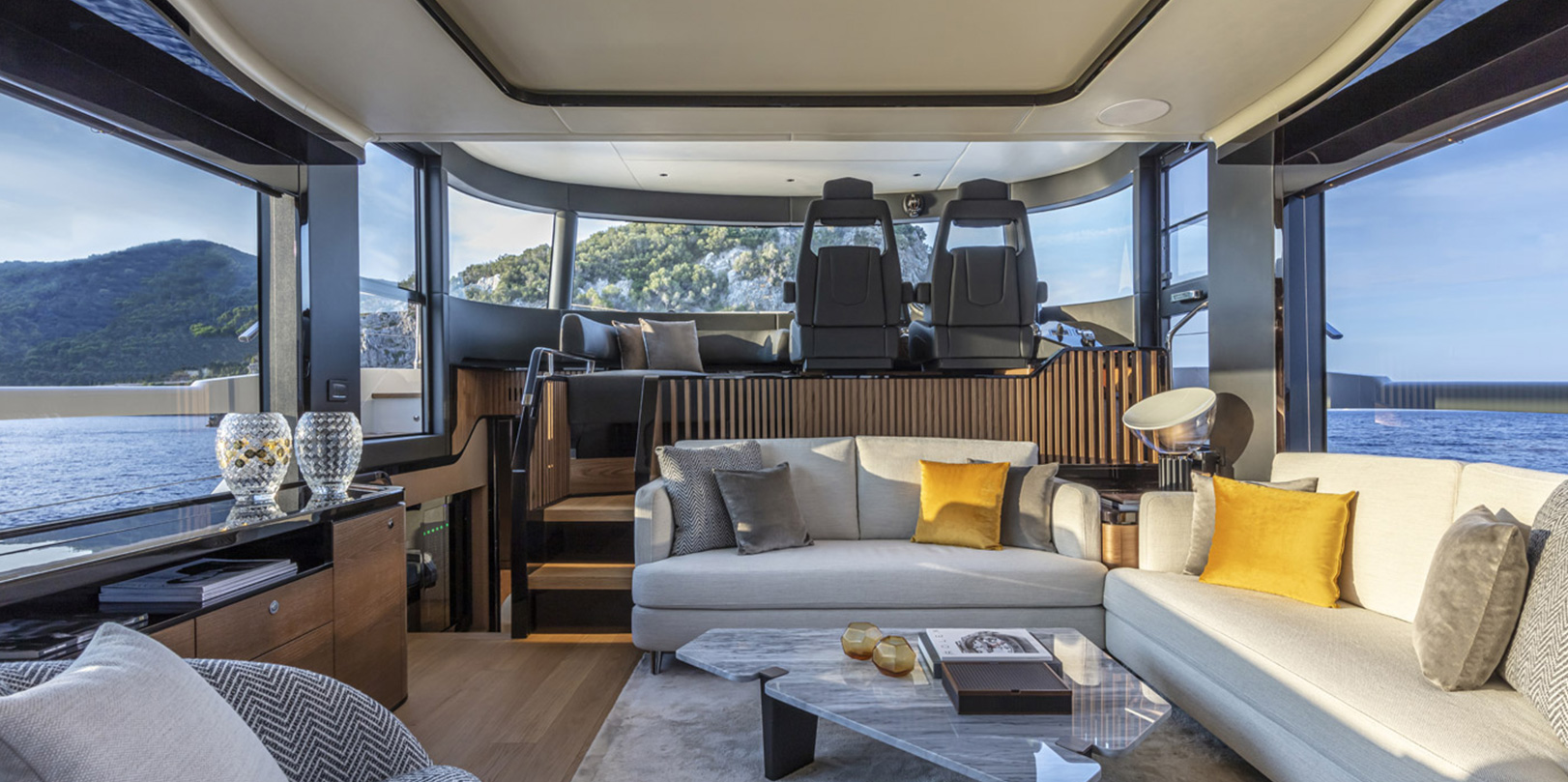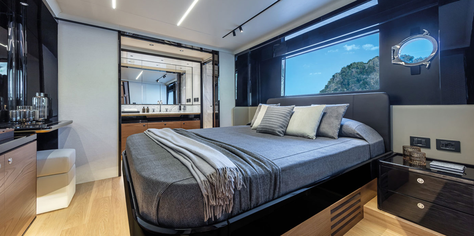 Aboard the Navetta 64, all the spaces are designed to offer the maximum enjoyment of the rooms—always panoramic and bright, thanks to unprecedented-size windows. In addition, the spaces are furnished and refined with everything you need to feel just like at home, without giving up on anything.