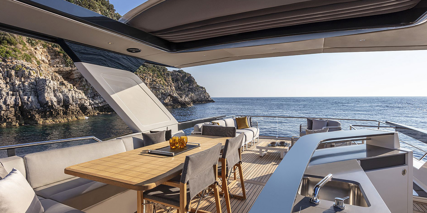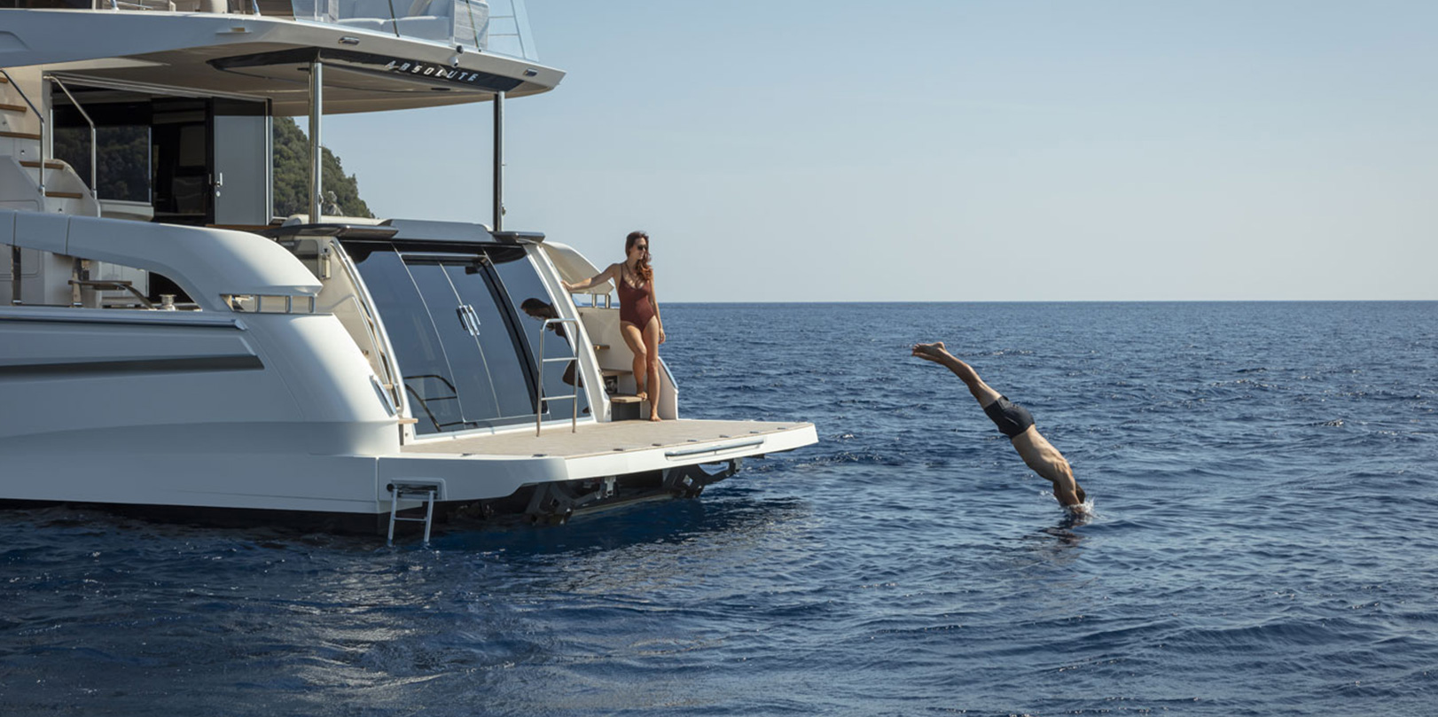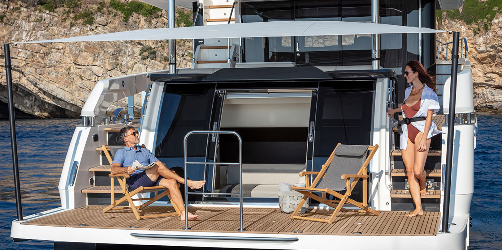 In the Beach Club version, the transom can be turned from large storage into an actual double cabin on the water’s surface thanks to a fully glazed watertight access door with a certified watertight seal.