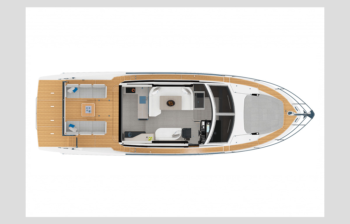 The exterior lines are now enriched by elegant transparencies, thanks to the glazed balustrades that offer breath-taking views from the cockpit. Designed without fixed elements, this area can be furnished for the owner’s taste, a new perk not found on most competitor’s boats of this size