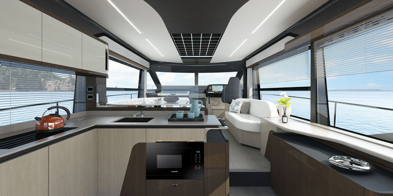 The exterior lines are now enriched by elegant transparencies, thanks to the glazed balustrades that offer breath-taking views from the cockpit. Designed without fixed elements, this area can be furnished for the owner’s taste, a new perk not found on most competitor’s boats of this size