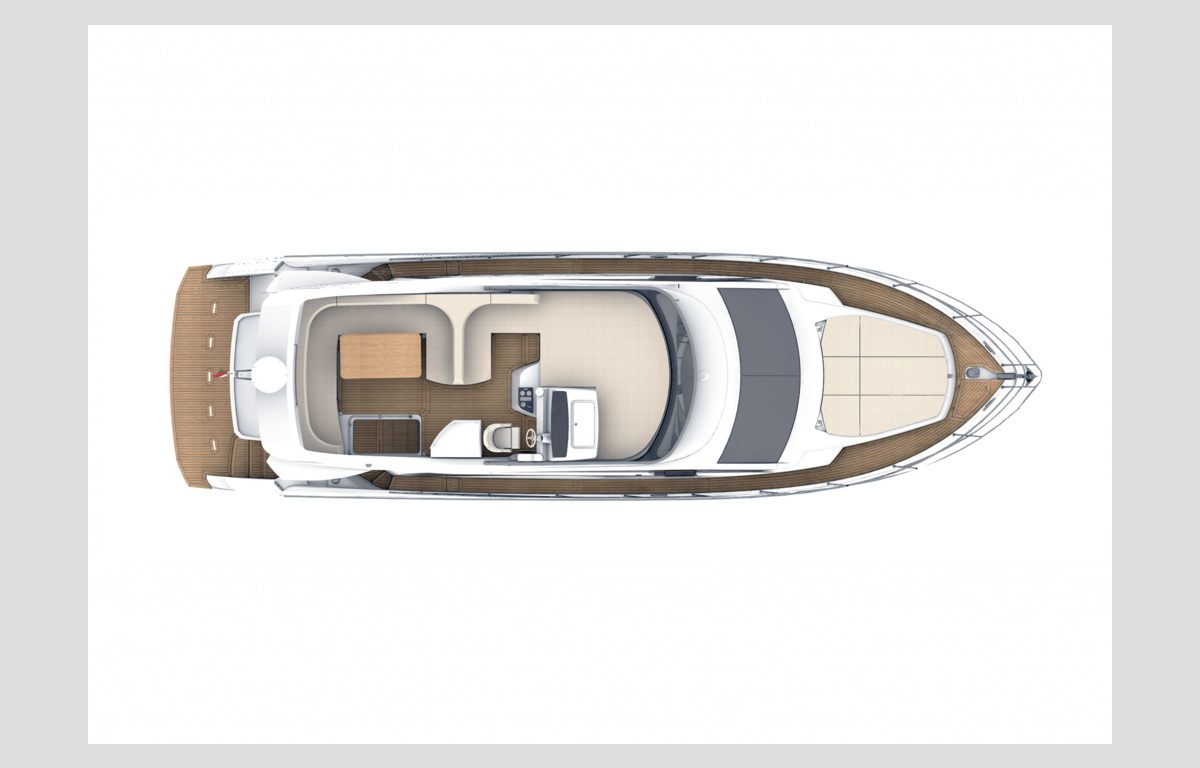 The ordered layout outlines a well-equipped galley that is cleverly connected to the cockpit, a salon with a double sofa, a dining table, and a technologically-advanced steering position. The helm is equipped with a side door to facilitate maneuvering operations with access directly the side walkway.