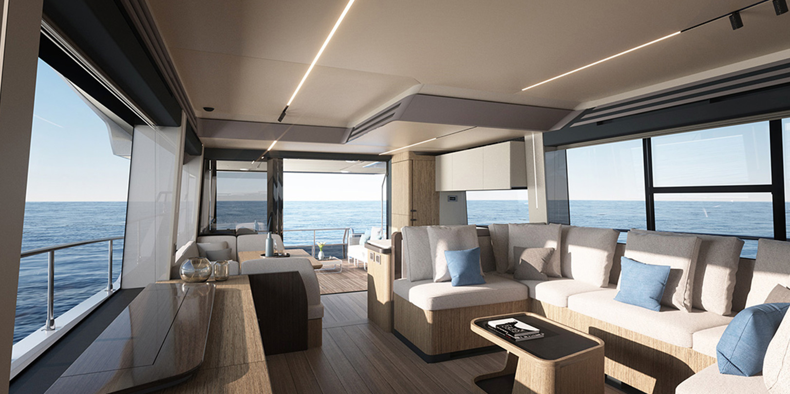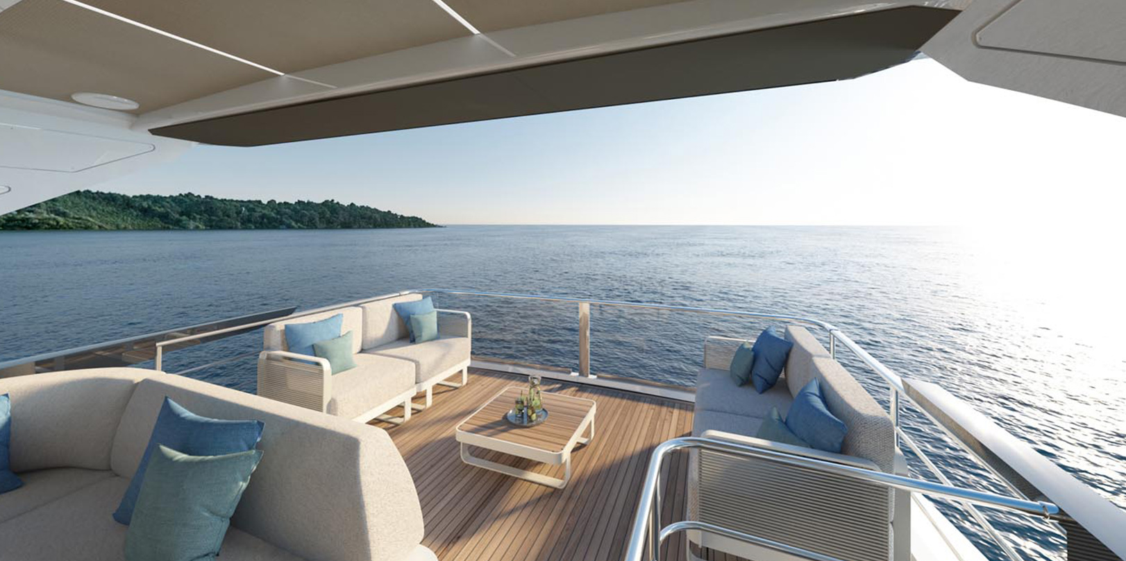 The design is dynamic and captivating, with external lines enriched by elegant transparencies thanks to the new glazed balustrades; large windows surround the main deck, creating exclusive contrasts and giving the interiors unparalleled luminosity.