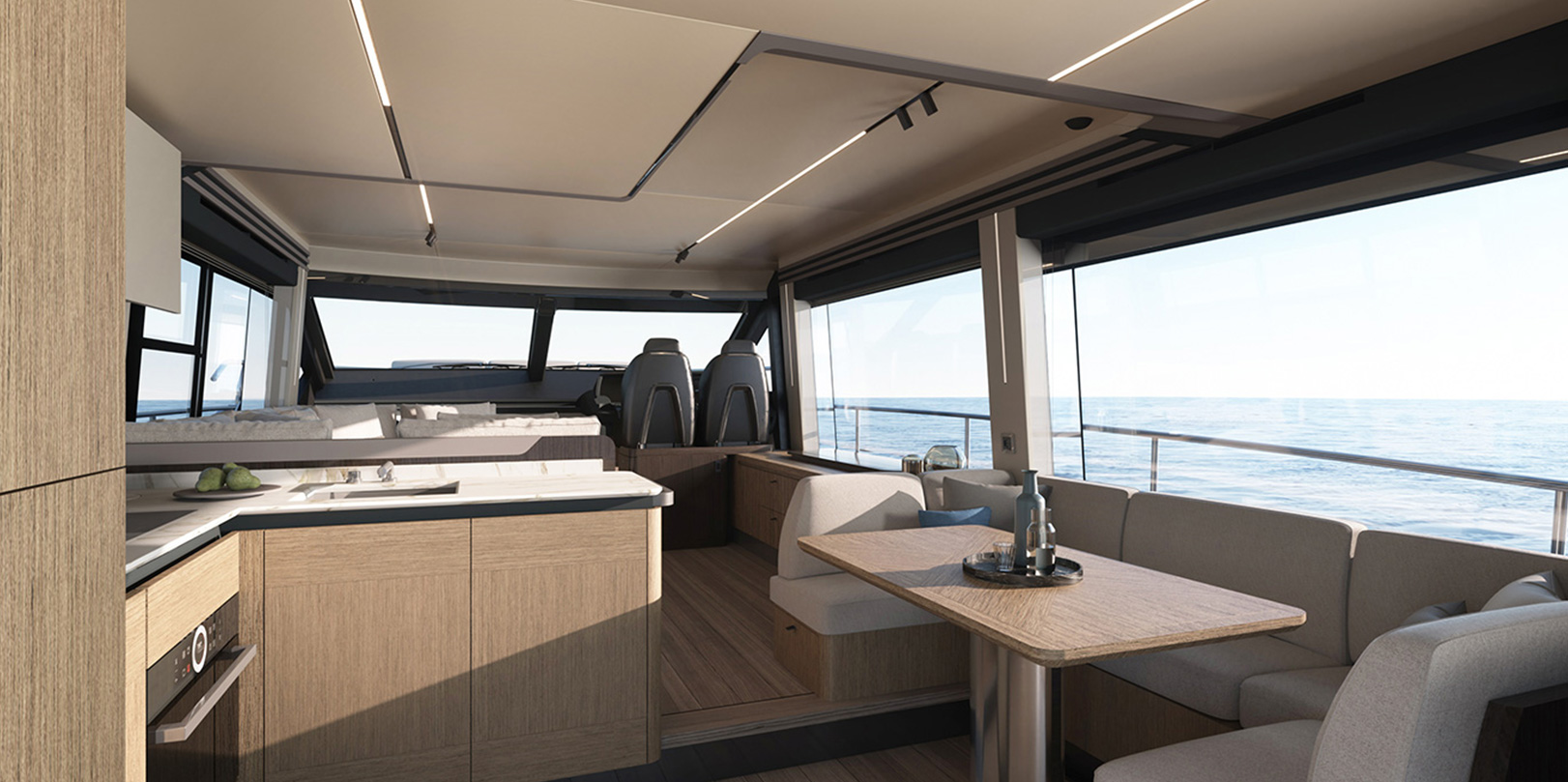 The aft cockpit is incredibly spacious and comfortable, does not include fixed structural elements, and can be furnished according to the actual use. You can simply choose between the various available configurations the one that most suits your onboard lifestyle and create spaces dedicated to the landscape, sociability, family, friends, and total freedom.