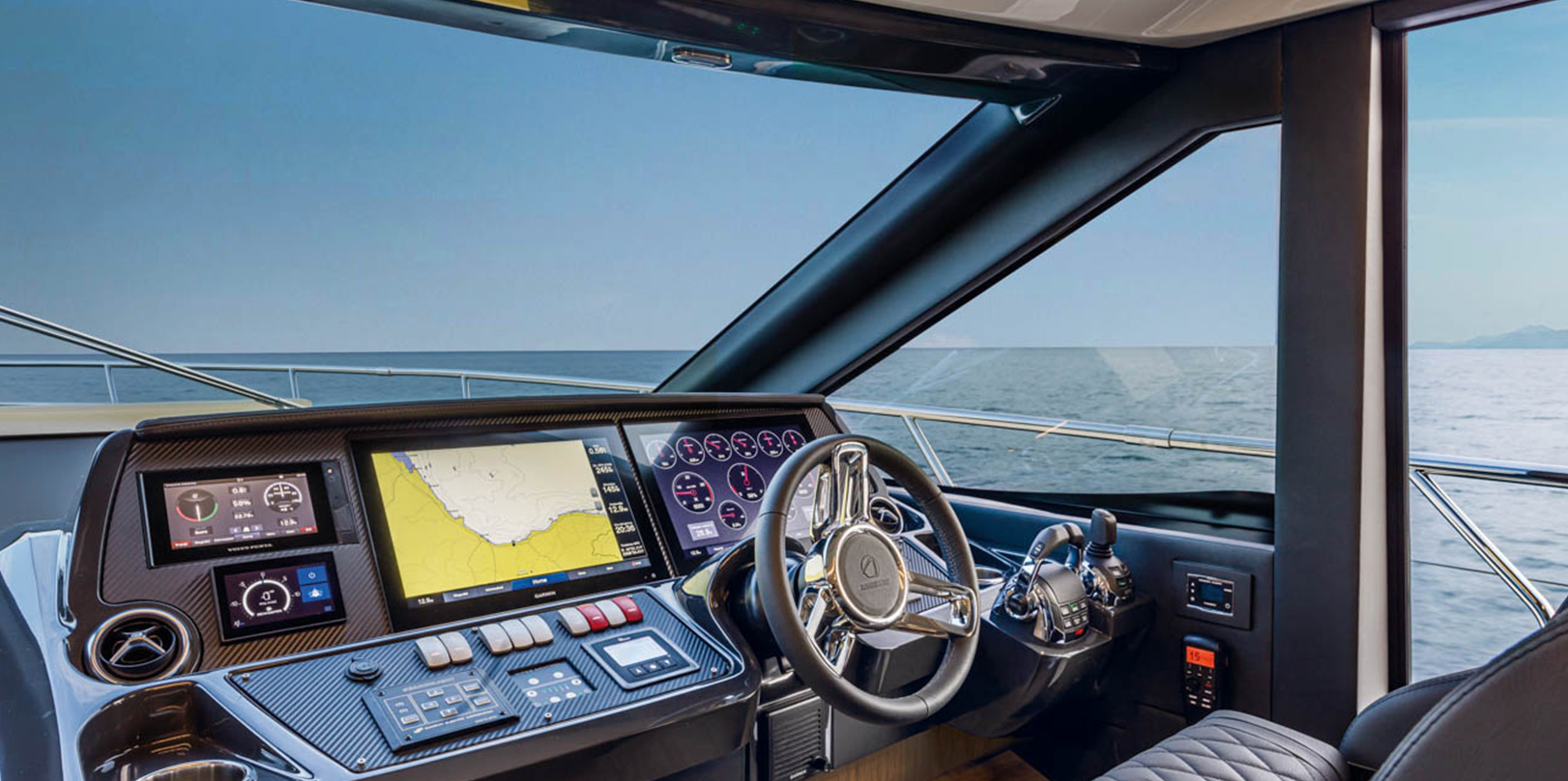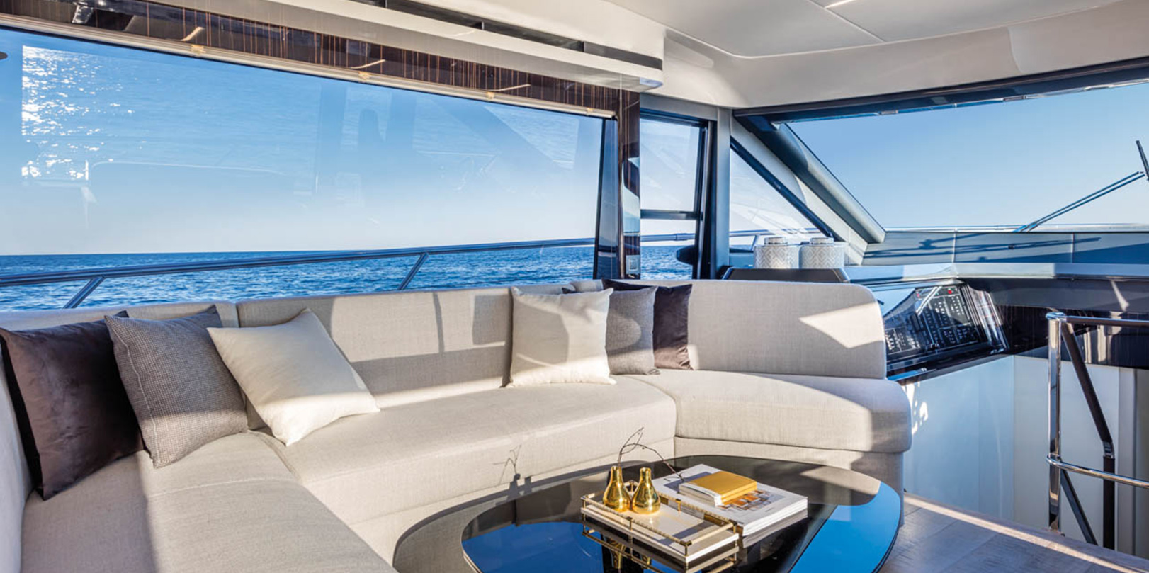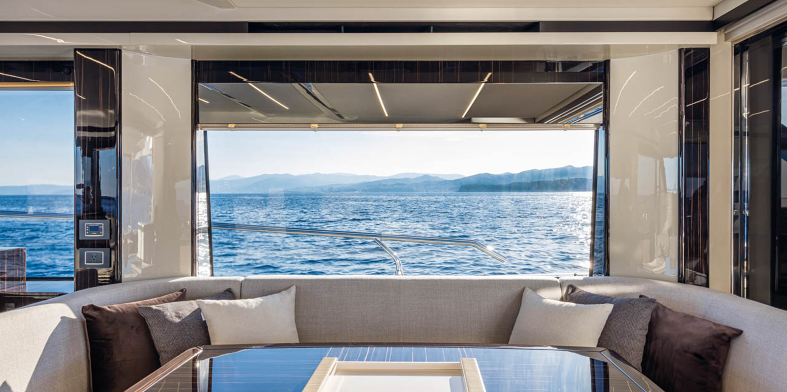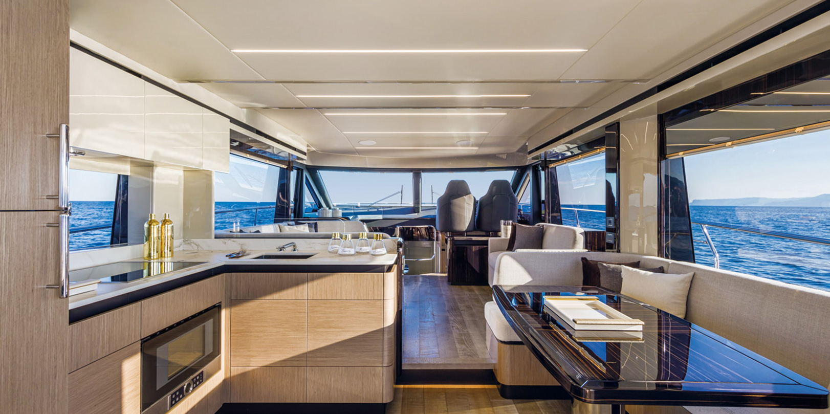 The spacious, versatile aft cockpit features a cozy sun lounger area, walkways to easily access the aft platform, the fly, the bow, and the beautiful main deck. Here, the layout and interior decor offer you and your guests an absolute level of comfort. Combinations and contrasts, in pure Italian style, enhance the elegance of the space with essence, leathers, and fabrics worthy of the best artisan tradition.