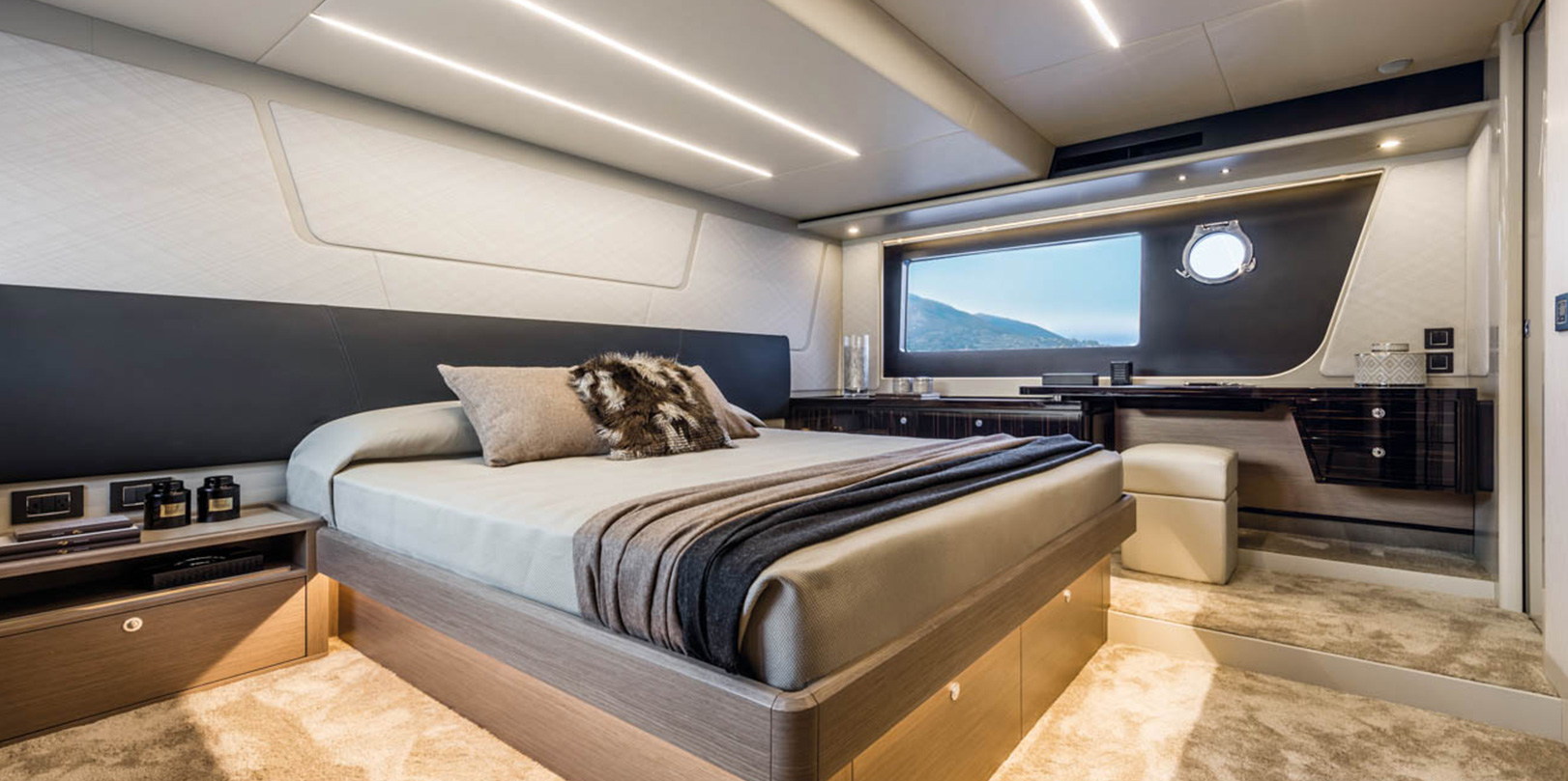 The VIP cabin is positioned diagonally: an ideal solution that ensures large surfaces—furnished with elegance and equipped with high-level en-suite services.
