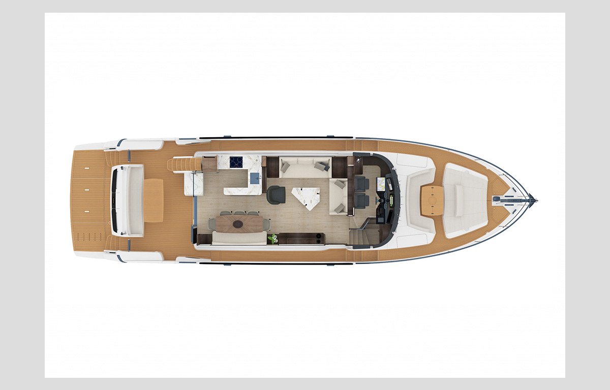 The flybridge, the largest in the category, gives space to conviviality and a pleasant atmosphere thanks to a large area where sofas and small armchairs are placed, but also to the way the living area is designed on the main deck, with the kitchen halfway between the internal “dining area”, finely furnished, and the external “dinette”. This yacht was born to be lived and to be the best frame for amazing life experiences.