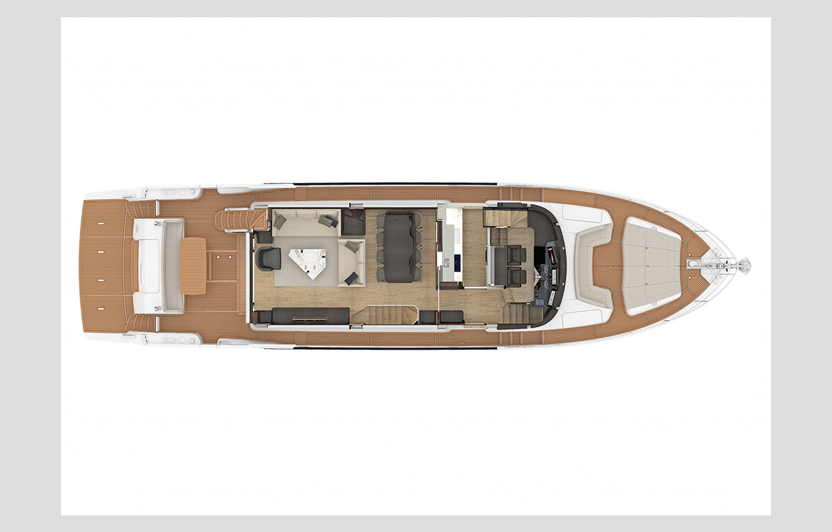 The very well-equipped galley is separated from the other rooms and takes advantage of an independent space, accessible directly from the external walkways. The ergonomic helm station is raised from the salon and has a modern, double-sitting position, as well as a side door that is particularly useful during manoeuvring operations.