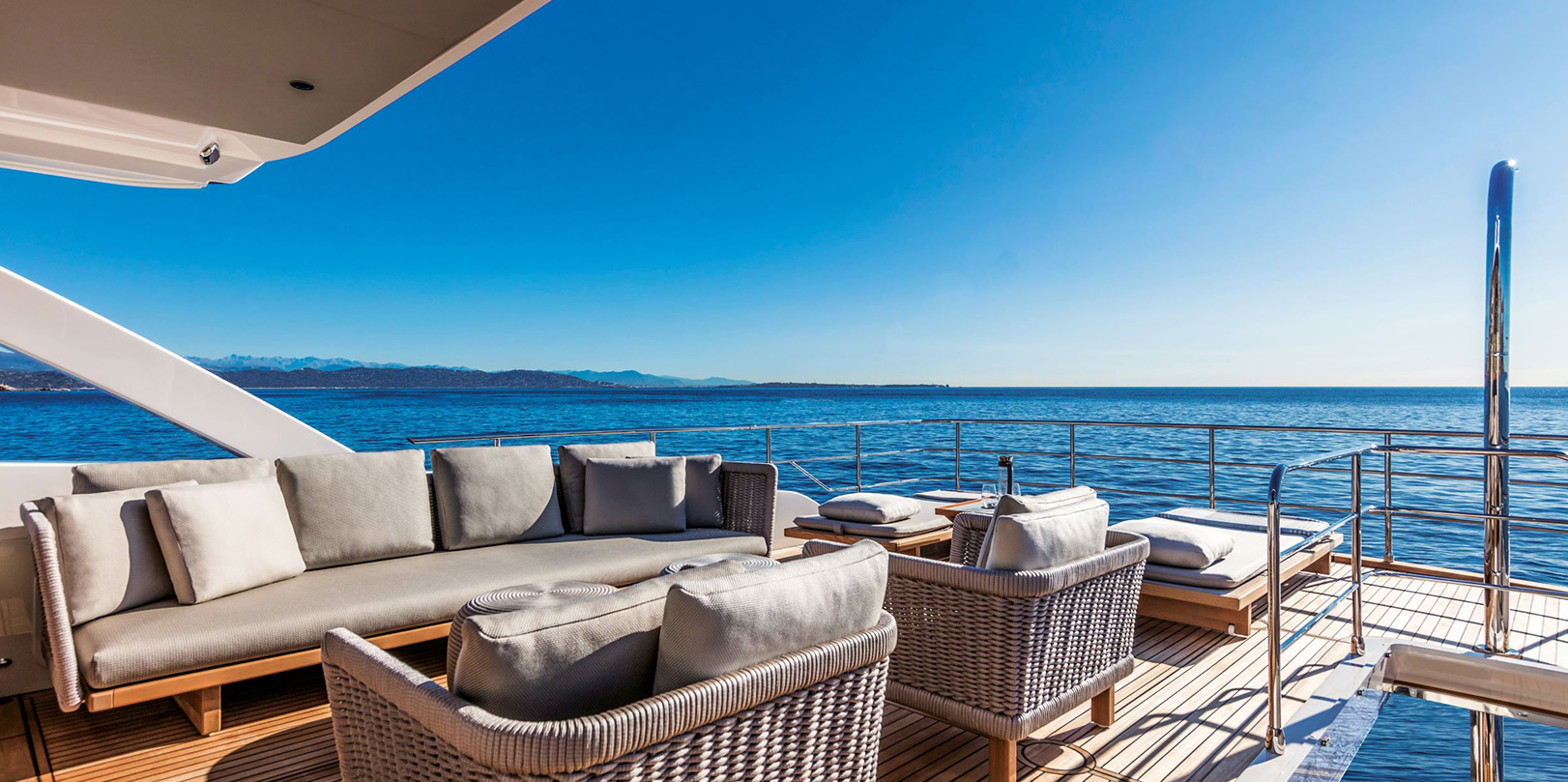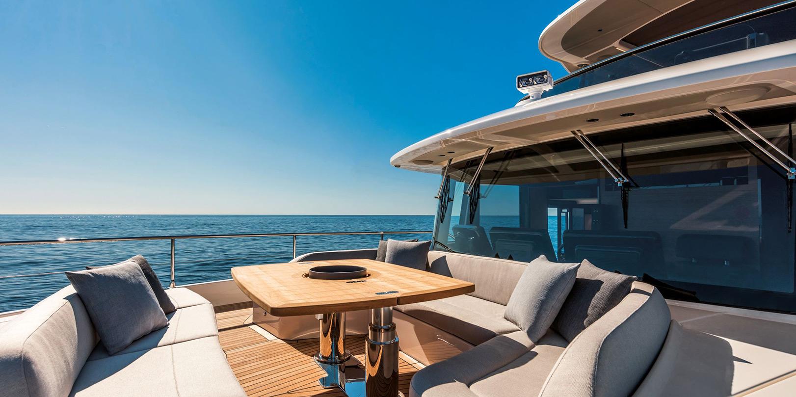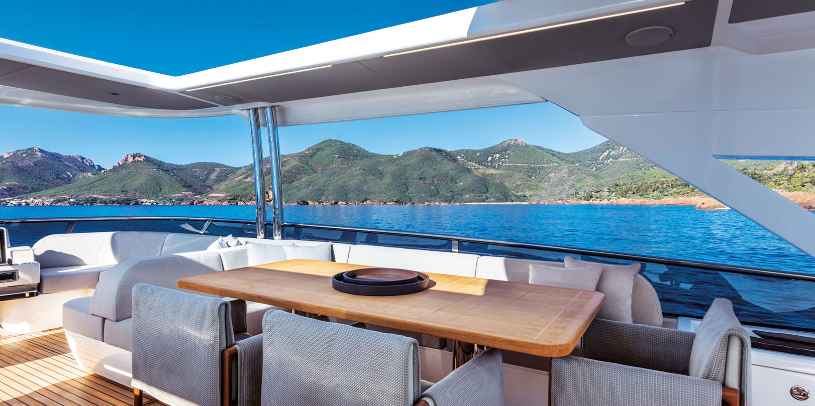 The flybridge offers an upper helm station with a side sofa, an elegant bar cabinet in front of a comfortable teak table, and an aft terrace with modular furniture.