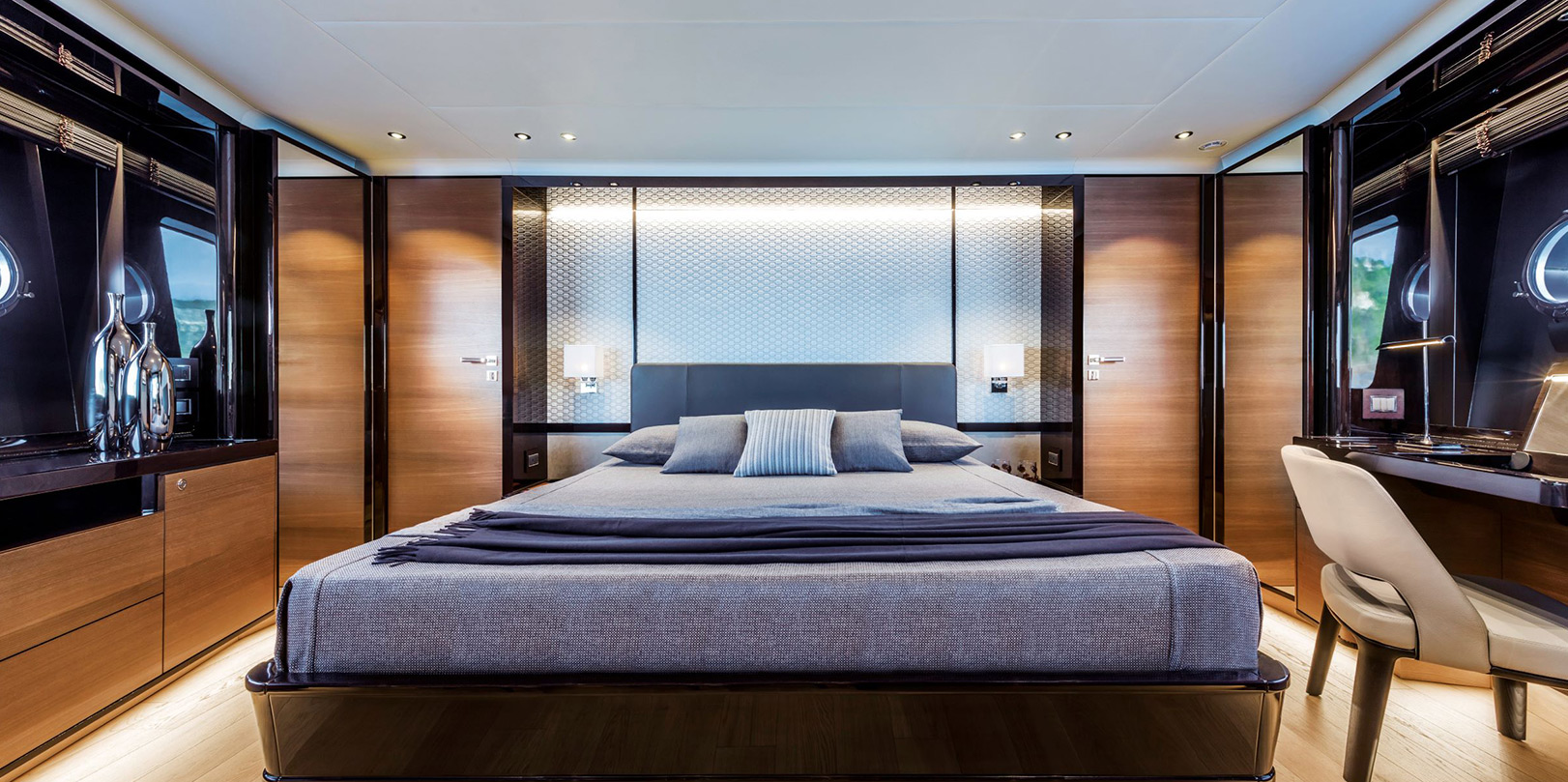 For the maximum privacy possible, the master cabin is in the bow, accessible separately from the bridge. The other guest cabins are all accessible from the interior staircase: the full beam VIP cabin and two double cabins.