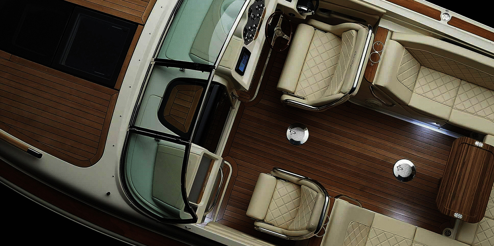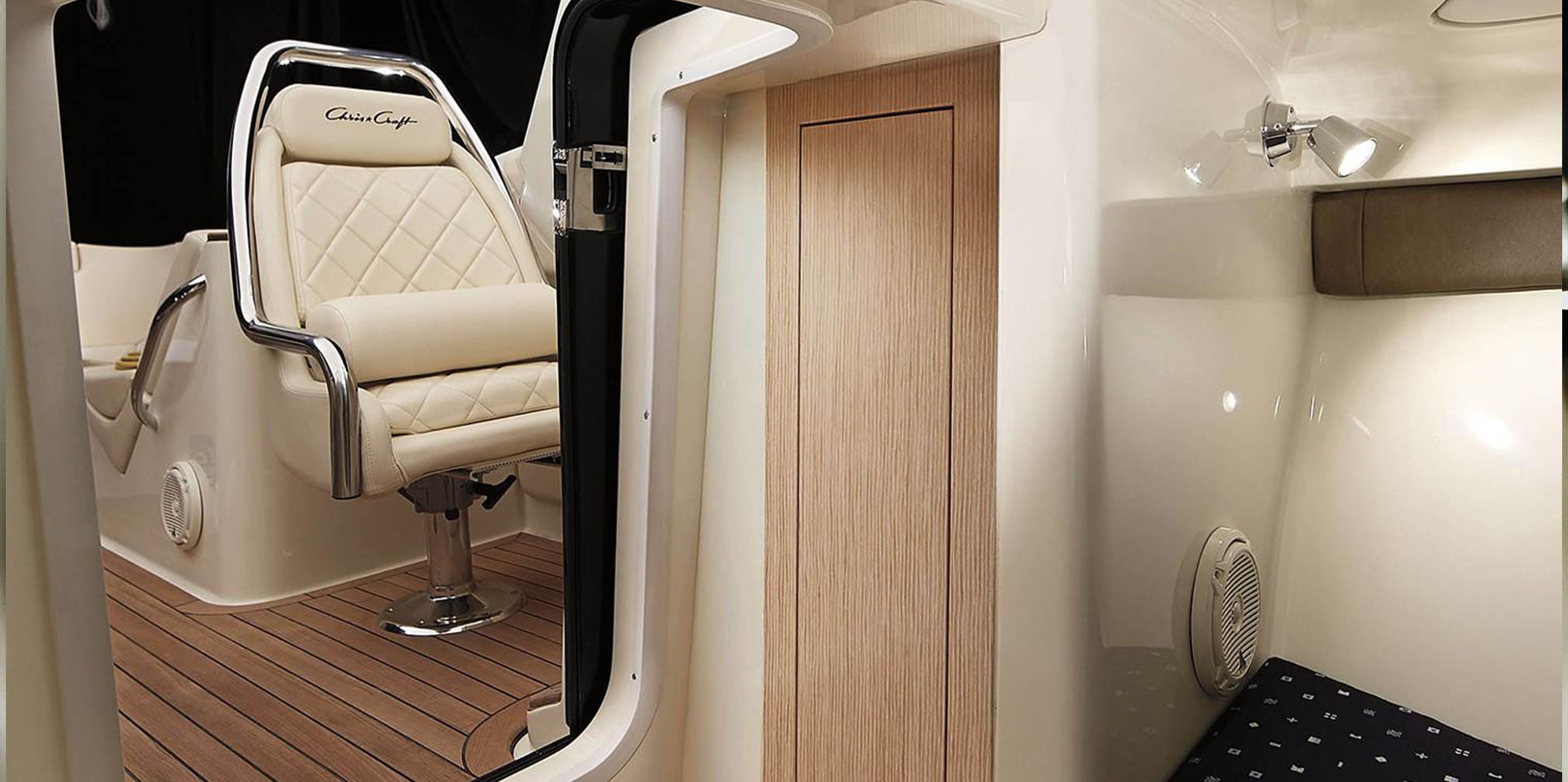 Chris-Craft design achieves two goals: incredible beauty and exceptional function. Case in point: This pair of sensuous S-shaped chaise loungers in the Corsair 30. They provide relaxing places to lean back and enjoy; by folding in the cushions, they transform into upright seating for guests.