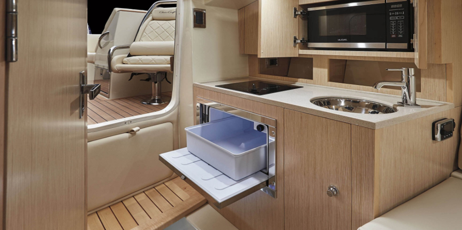 Only the highest quality marine vinyl and custom fabrics are selected for Chris-Craft interiors. Choose from 9 solid and two-tone color combinations to create the Corsair 34 that is uniquely yours.