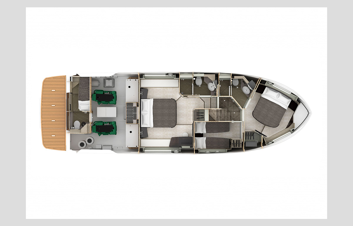 The lower deck is equipped with sliding doors for space optimization and includes three cabins; two double,one twin, and two heads. The ceiling height is excellent with space maximized to the fullest, providing every guest with the ultimate in livability.
