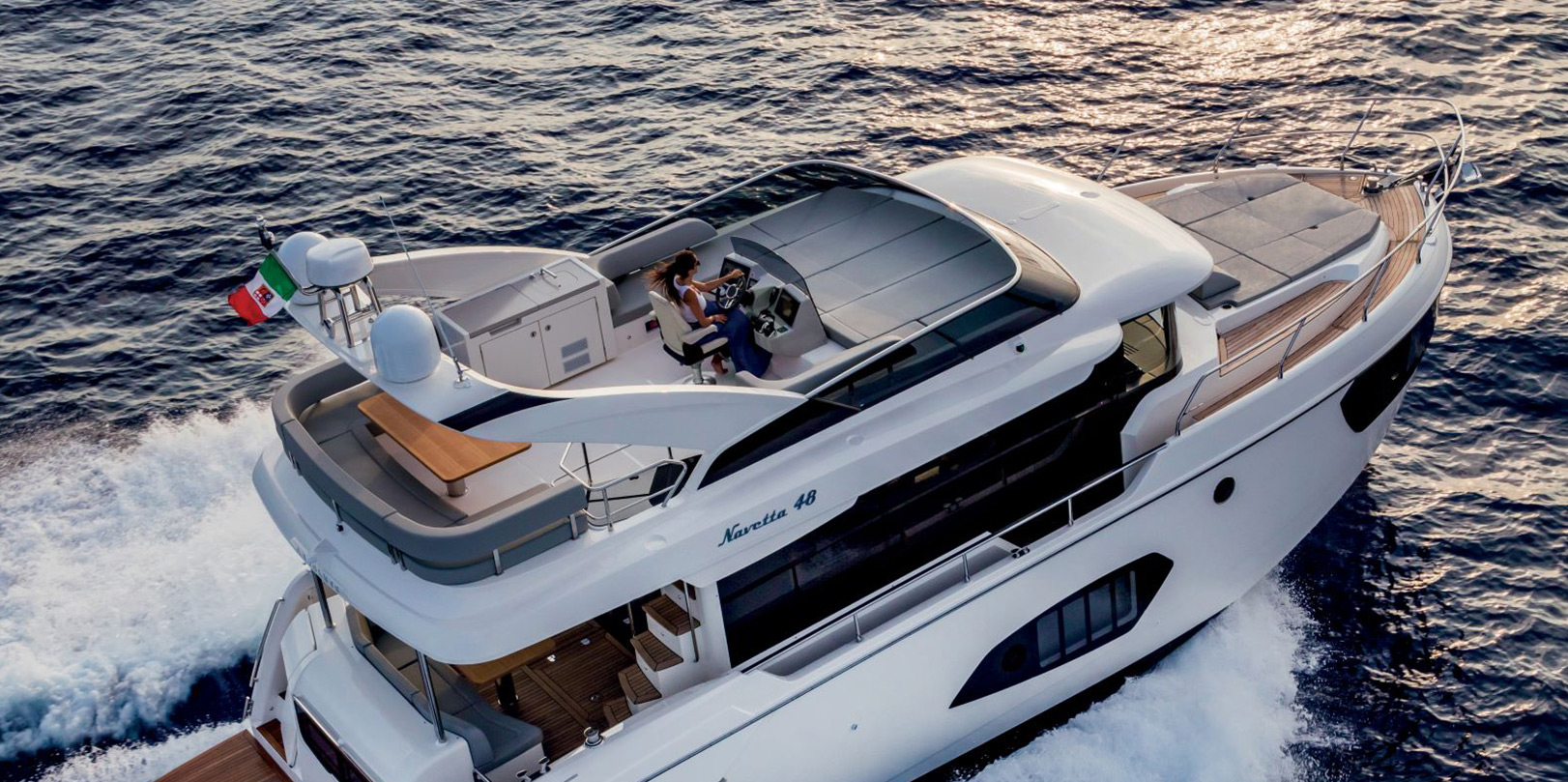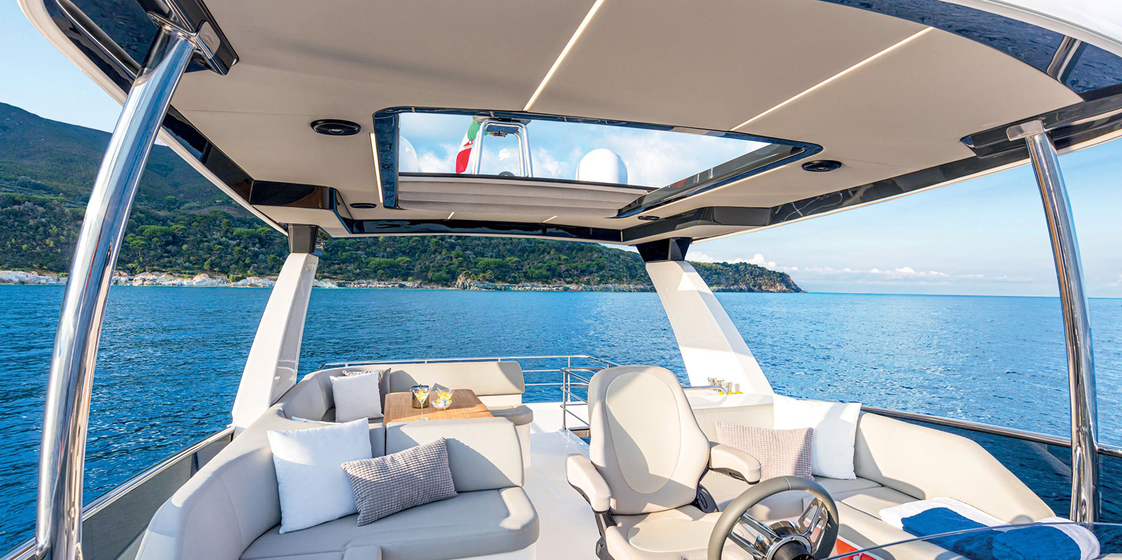 The helm station is modern and ergonomic, integrated with EmpirBus home automation technology, and equipped with a comfortable side door to ensure full autonomy of the shipowner, even during maneuvering operations.