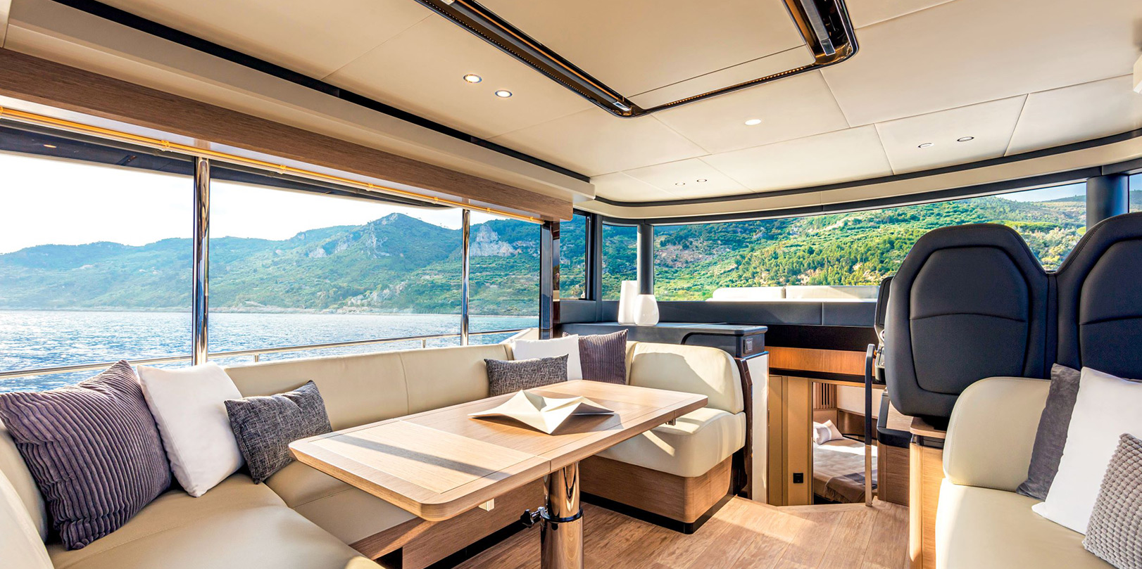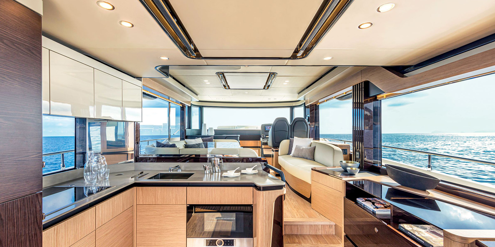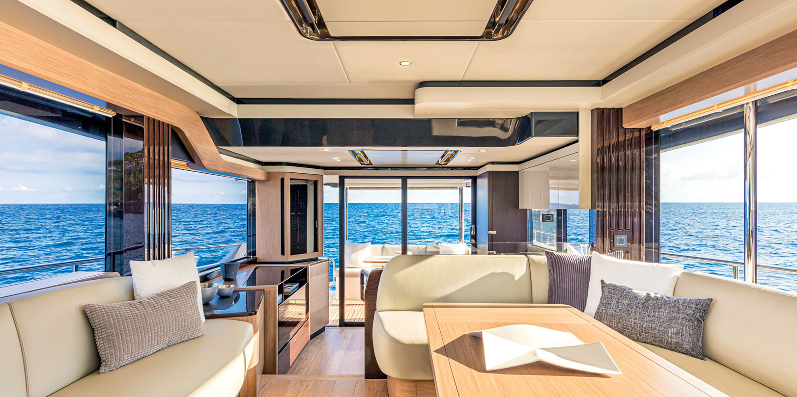 Inside the main salon, the 360-degree view makes you almost feel surrounded by picturesque windows displaying the ocean. The decor is elegant and refined, the spacious galley is well-equipped, and can be connected to the cockpit to create a functional open space that overlooks the water.