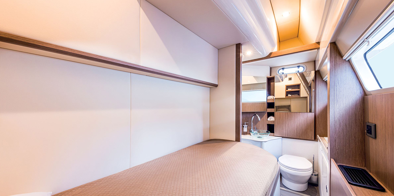 At the bow, the VIP cabin is generously furnished and with its color contrasts, combined with the great brightness, contributes to its elegance. Finally, the third bedroom has two single berths.