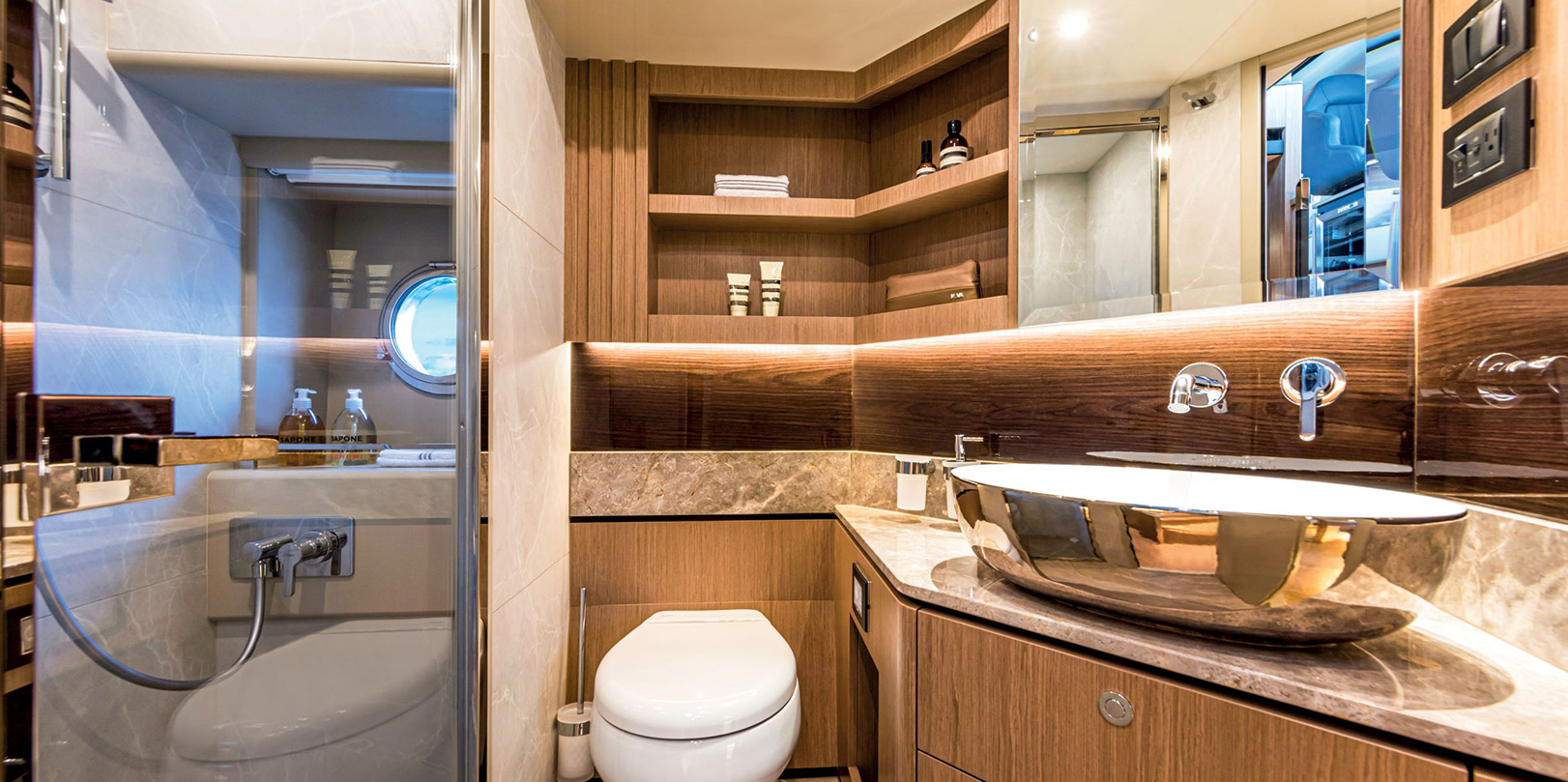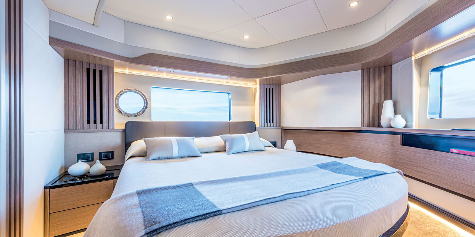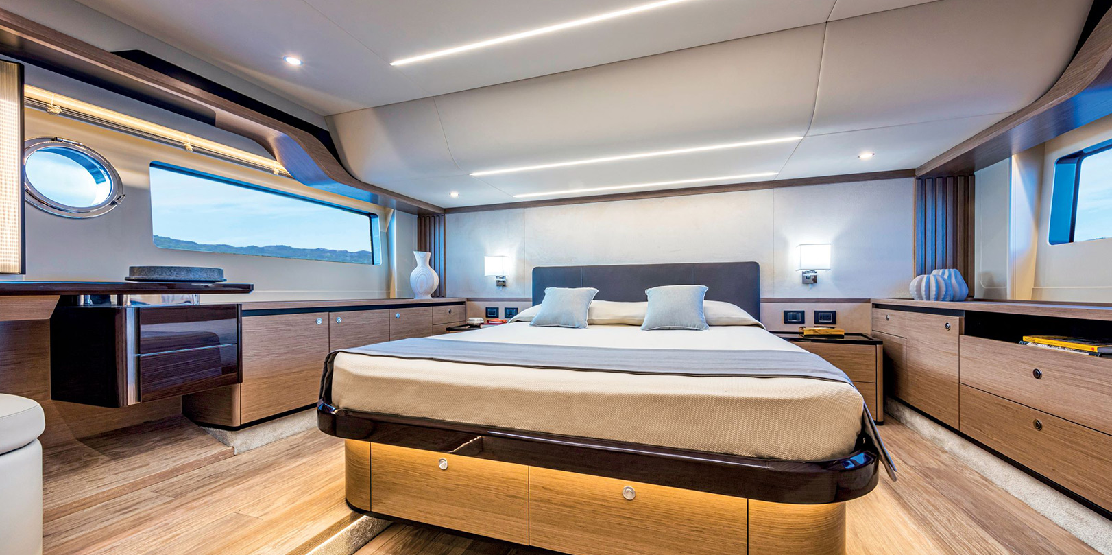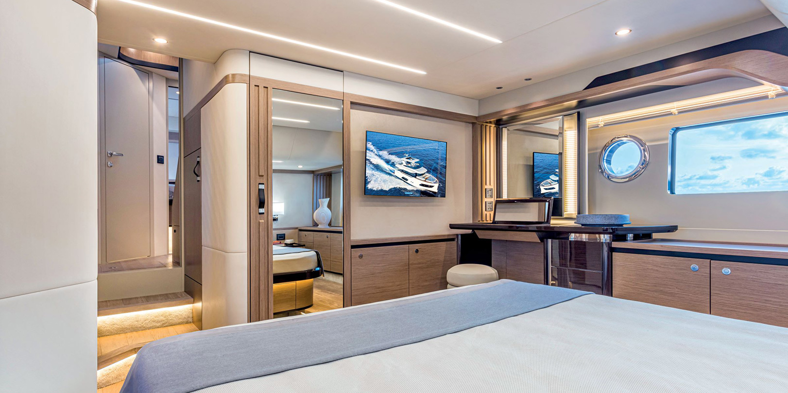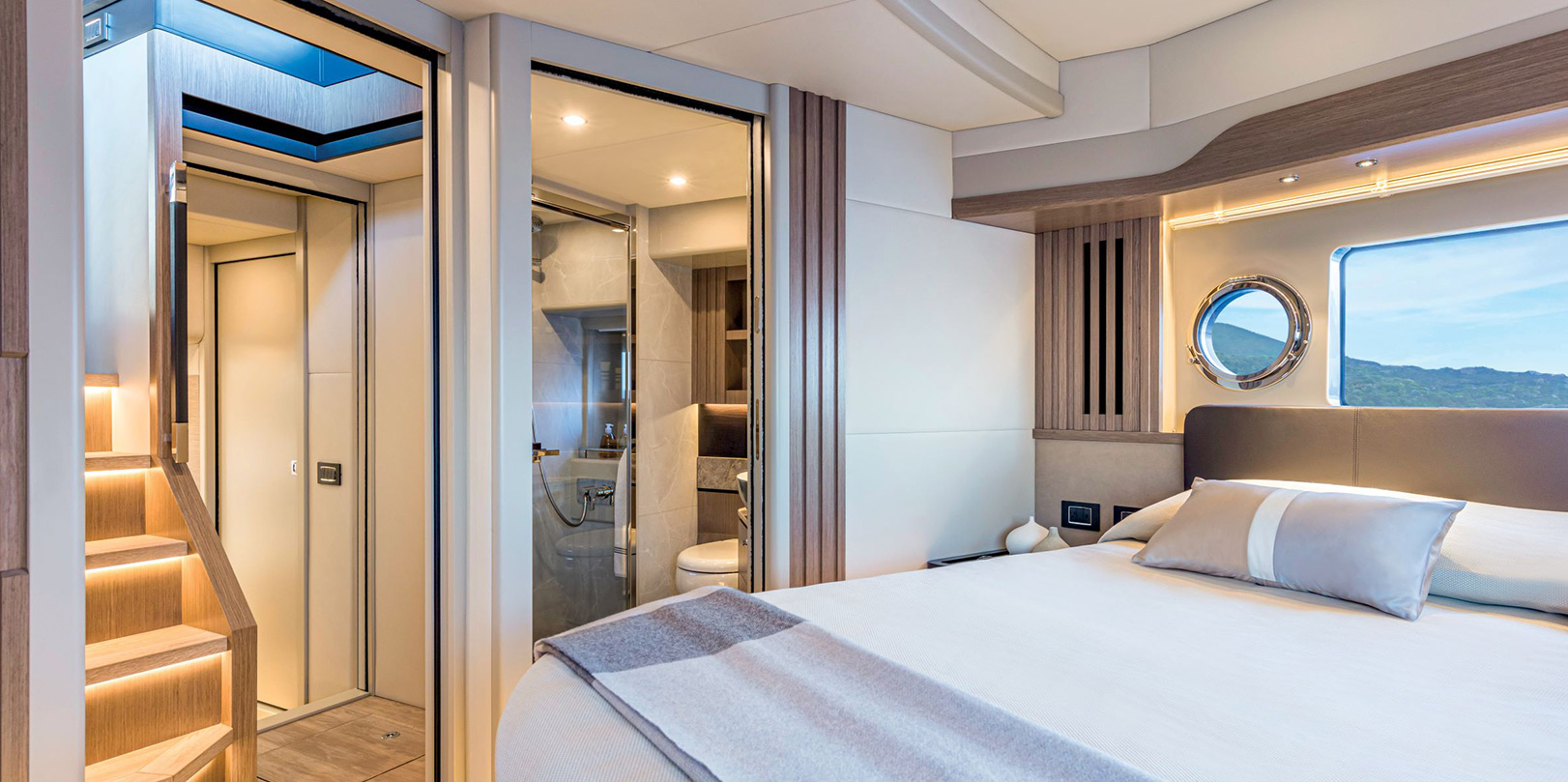 The spacious full-beam master cabin is placed midship, with a large double bed, a desk, a vanity area, and panoramic windows on both sides. The walk-in closet, the low pieces of furniture along both sides, and the drawers under the bed ensure maximum comfort for storing luggage.