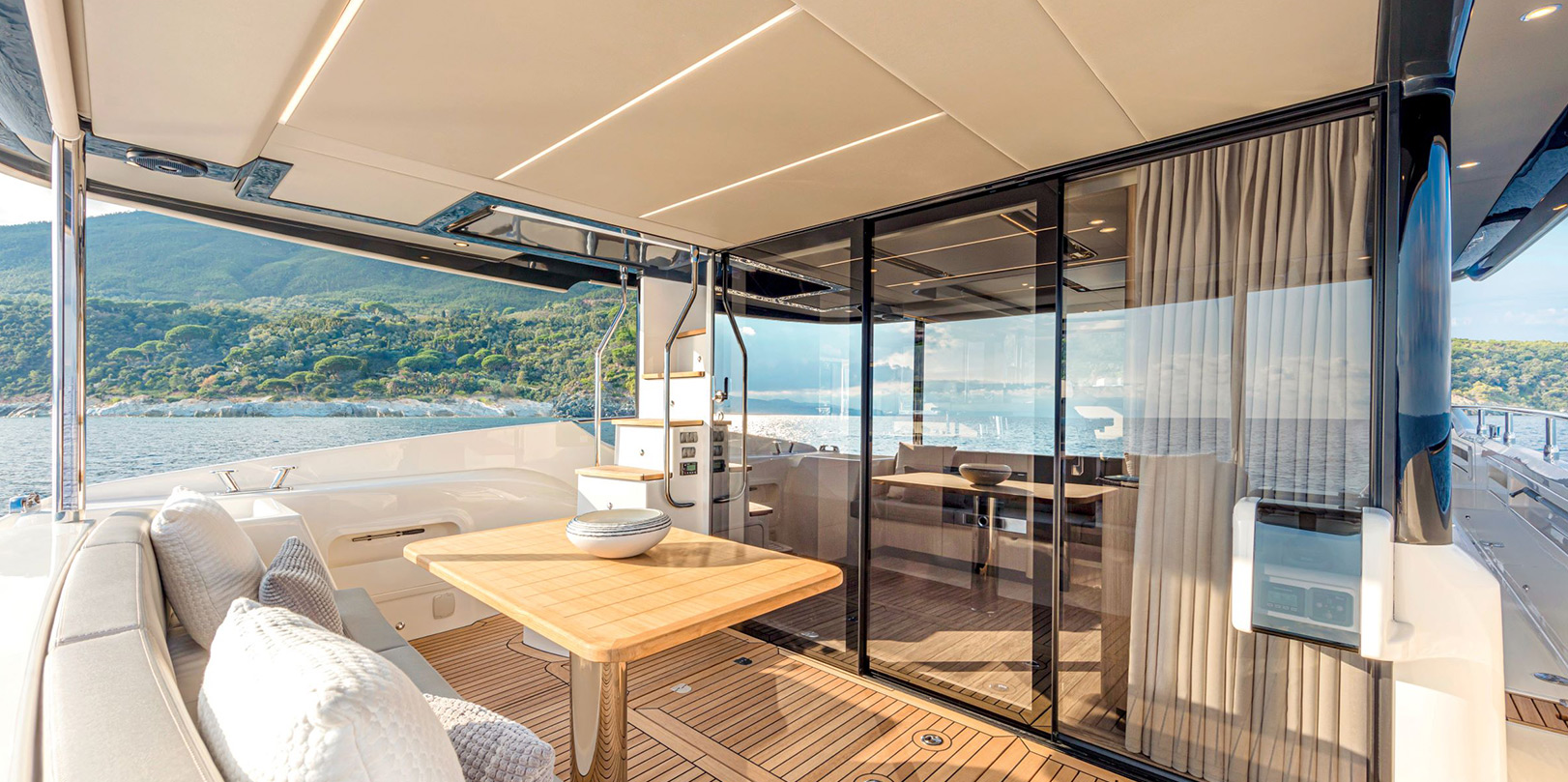 The fly area has a well-equipped helm area surrounded by sofas, an outdoor galley with a comfortable dining table, and a panoramic terrace. At the bow, you find spacious, modular sun loungers that are highly versatile and encourage socializing.