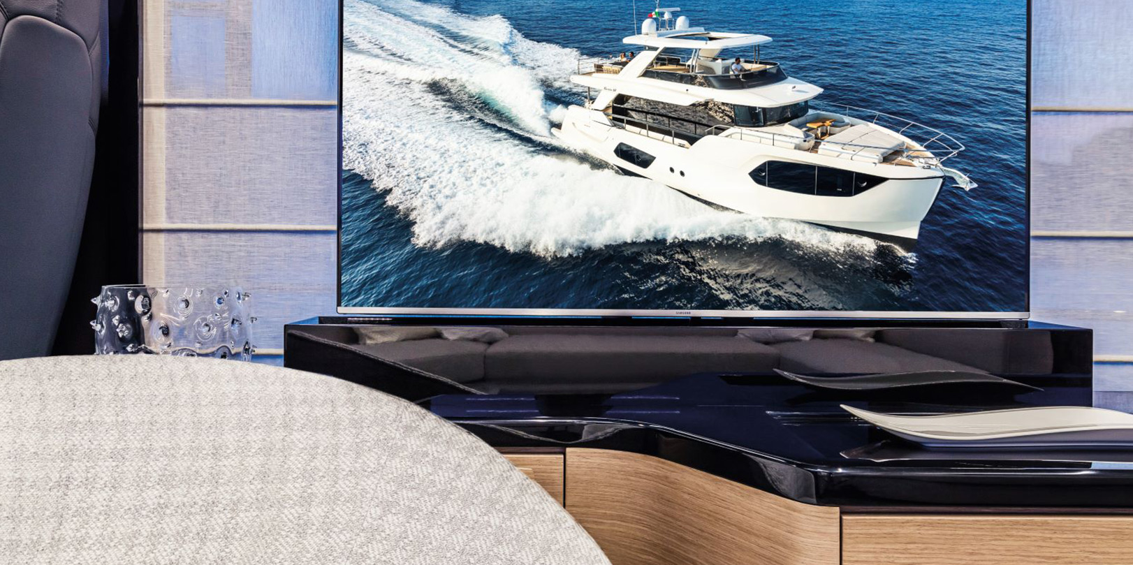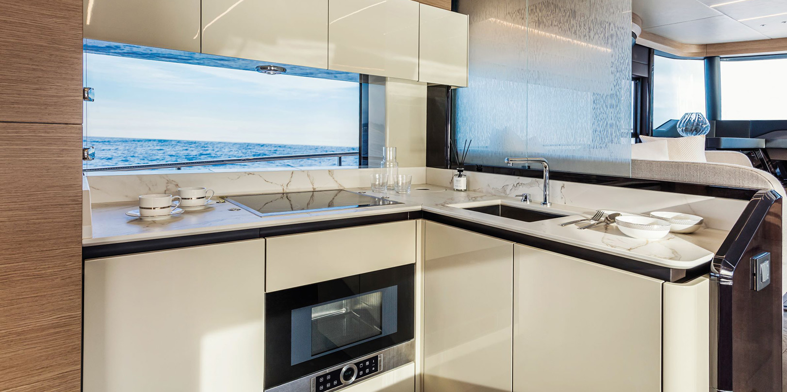 The salon and cockpit—finely furnished and well-equipped—are perfect for a practical and dynamic life on board. The aft galley has a large worktop, a full-sized fridge, a four-burner cooktop, a sink, a dishwasher, and is separated by an electric sliding glass partition.