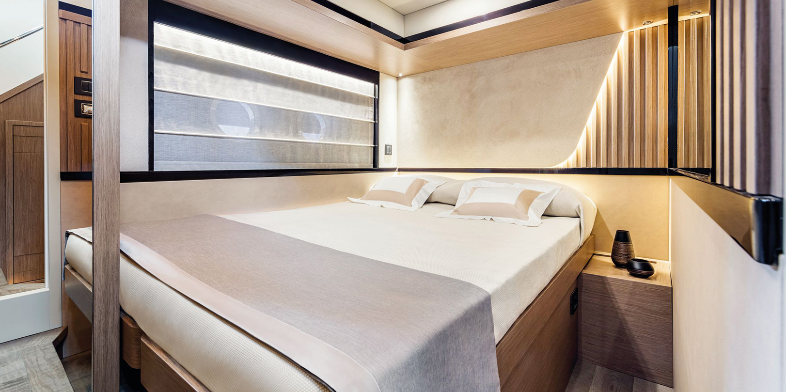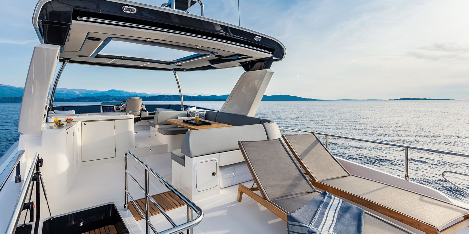 Outdoors, relaxation is ensured by the sun loungers on the flybridge and in the bow area, reachable with ease and maximum safety. On the upper deck, you find a central helm station, a comfortable bar cabinet, a dining table with two sofas, and a panoramic, protected terrace. The bow area has an enviable sundeck, reachable thanks to wide, side-walkways and ergonomic handrails.