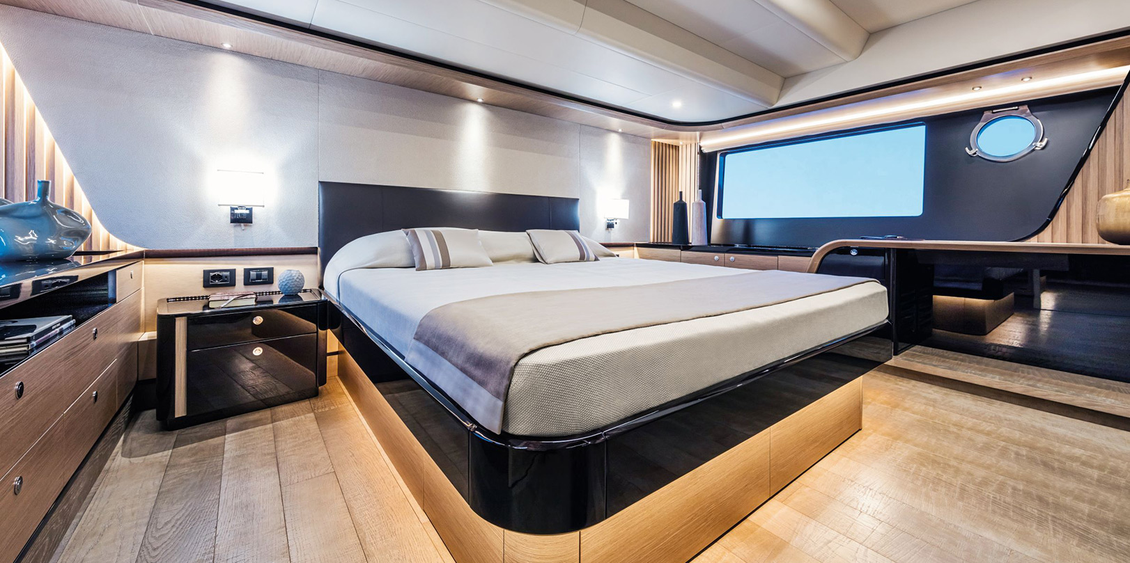 The helm station is ergonomic and has no central pillars on the windshield, ensuring unparalleled visibility whether standing or seated. The dashboard features EmpirBus home automation technology and can be equipped with two 17-inch GPS monitors with an access door to the side walkway to ease mooring operations.