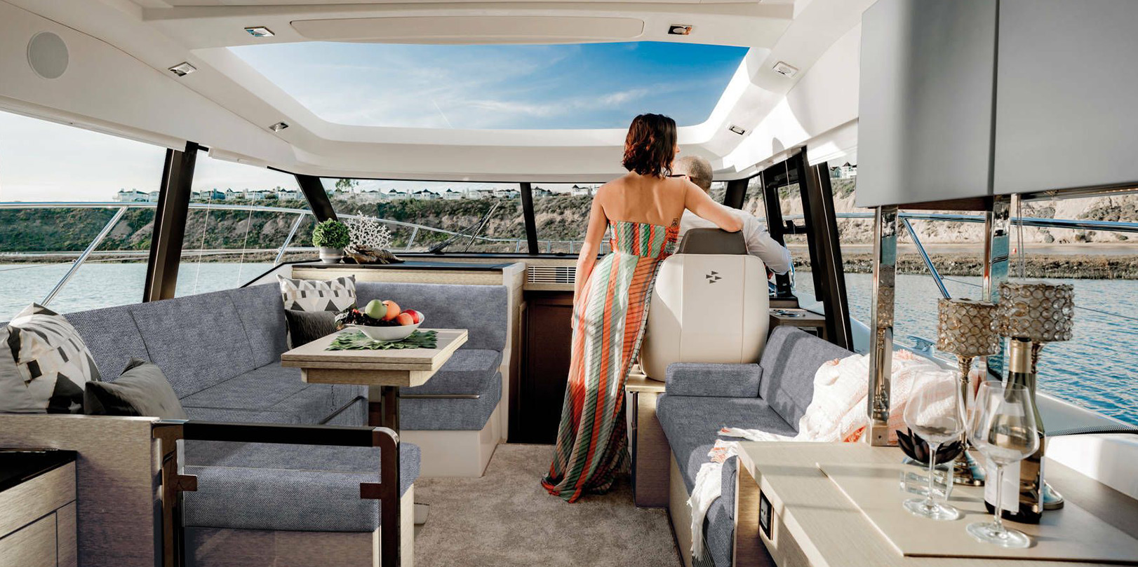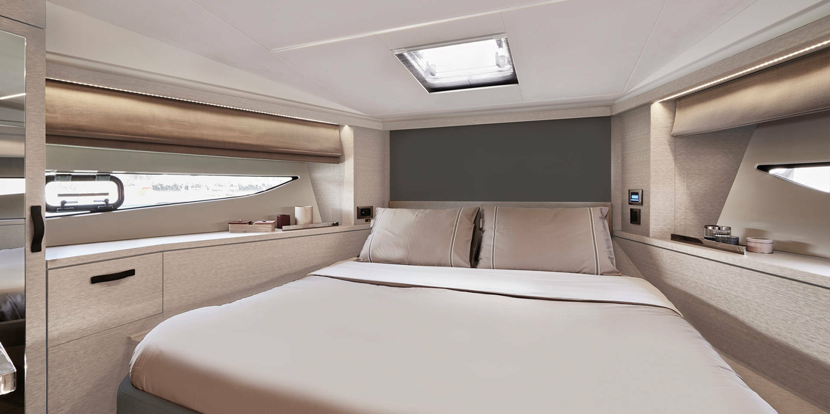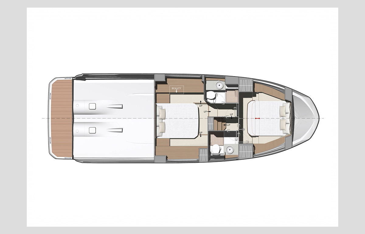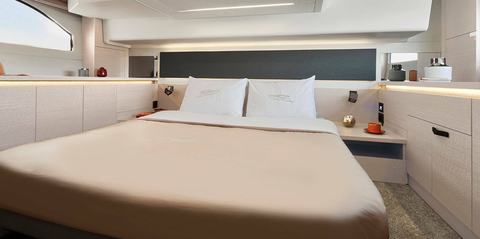 The NEW PRESTIGE 420Snew offers sumptuous moments of well-being and enjoyment onboard. Inside, the intelligent layout and refined design are highlighted through the exceptional luminosity, afforded by the large opening roof. The NEW PRESTIGE 420Snew is an innovated and pleasant yacht, thanks to the single-level flooring and spacious living areas. The aft master stateroom offers a cozy atmosphere and high-quality features: a large central double bed and a private bathroom.