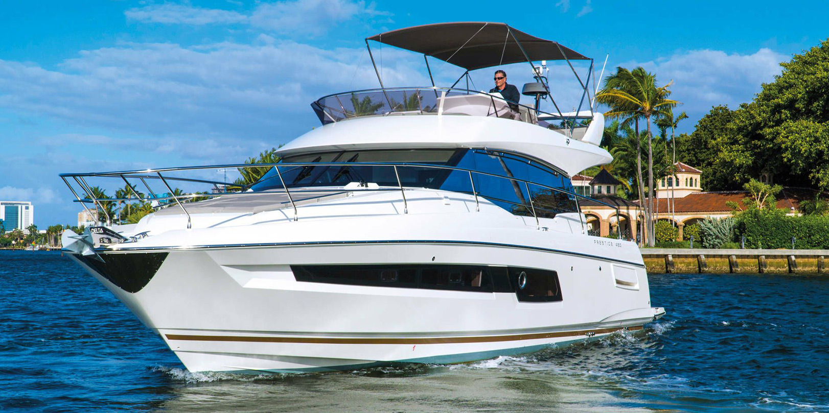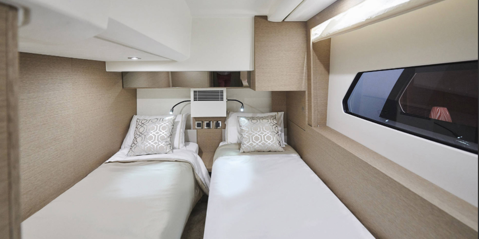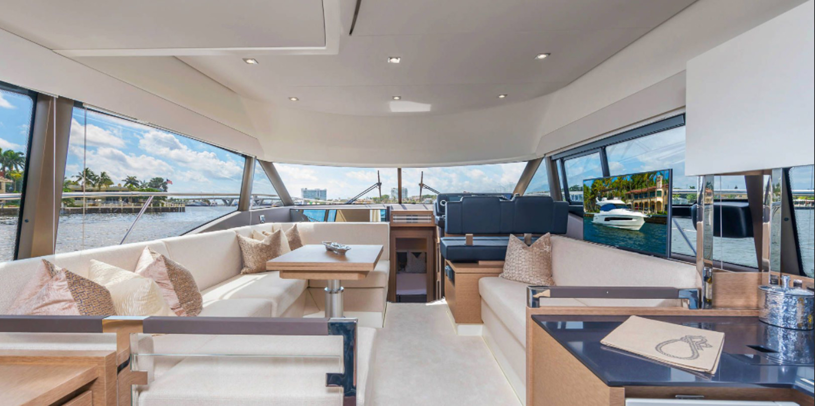 On the exterior, she features the signature style of the latest PRESTIGE Yachts, with an expanded, continuous line of windows in the hull. This Flybridge integrates the concept of the L-shaped cockpit, which allows for maximum use of space. Transformable into a very large aft sundeck, this cockpit can also house a fully equipped skipper cabin.