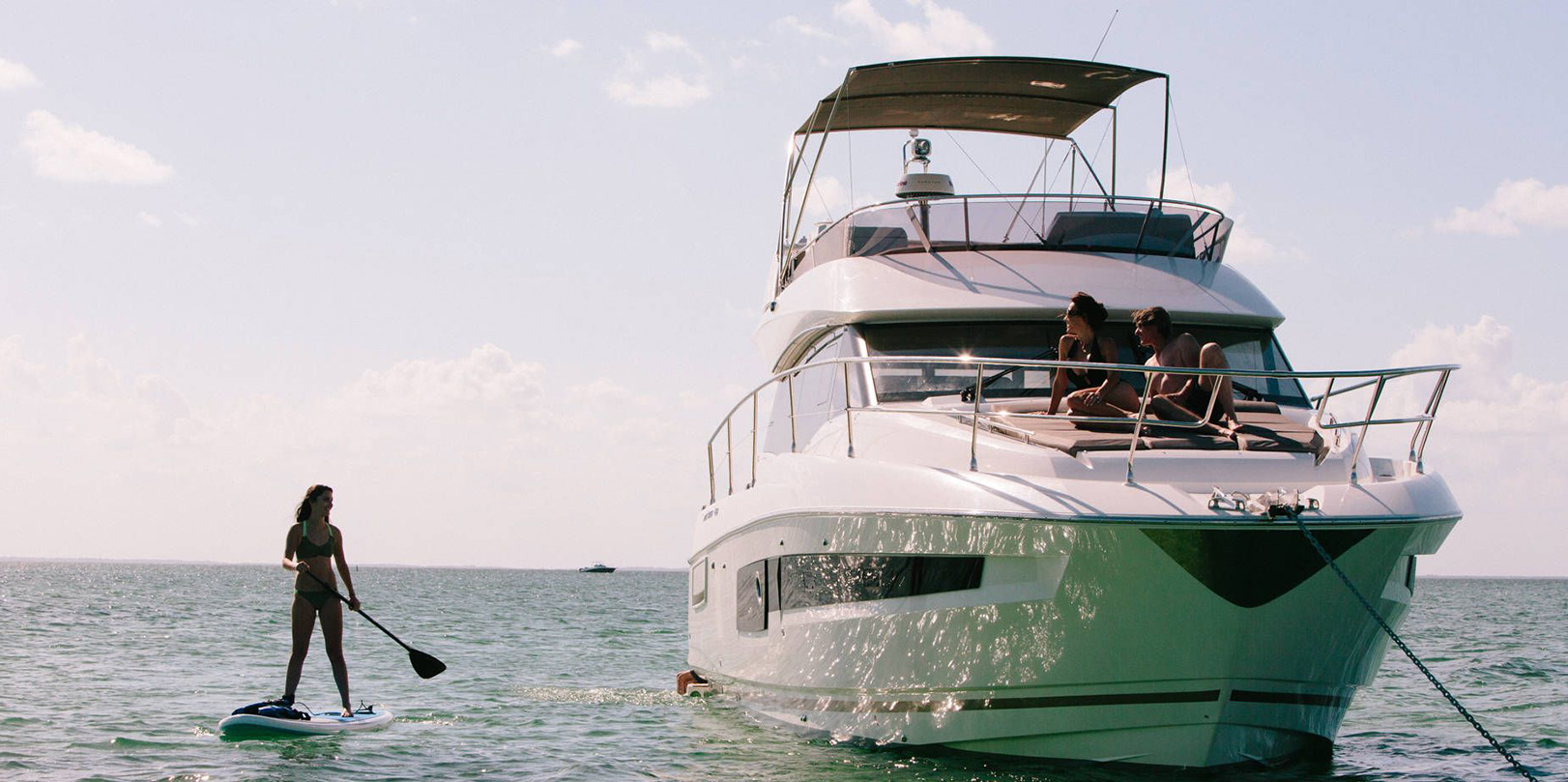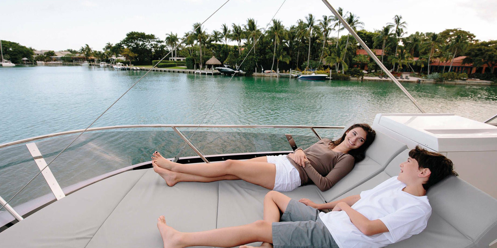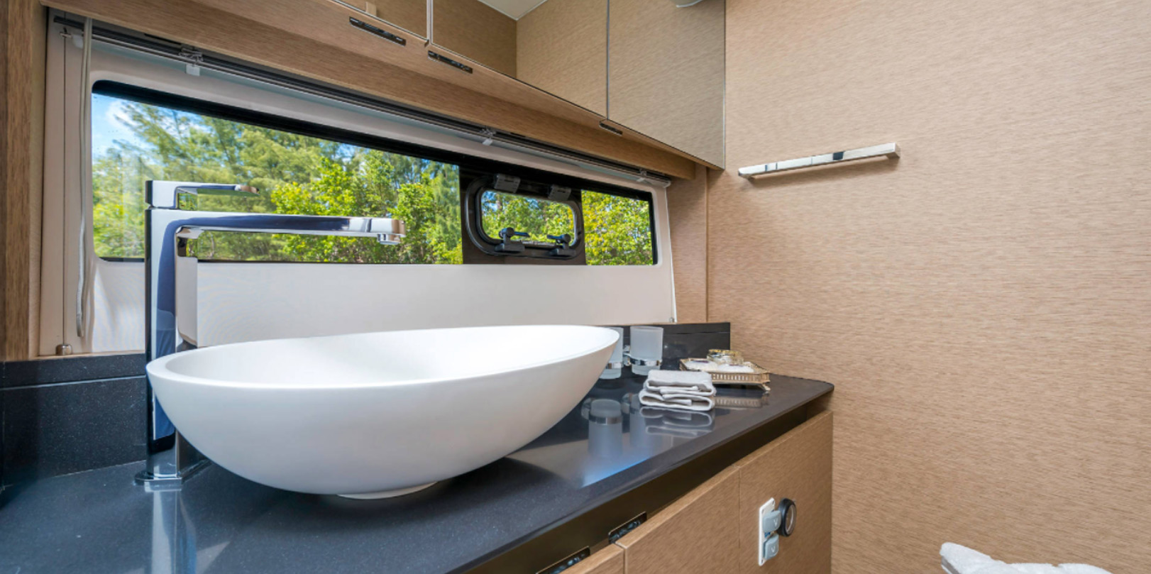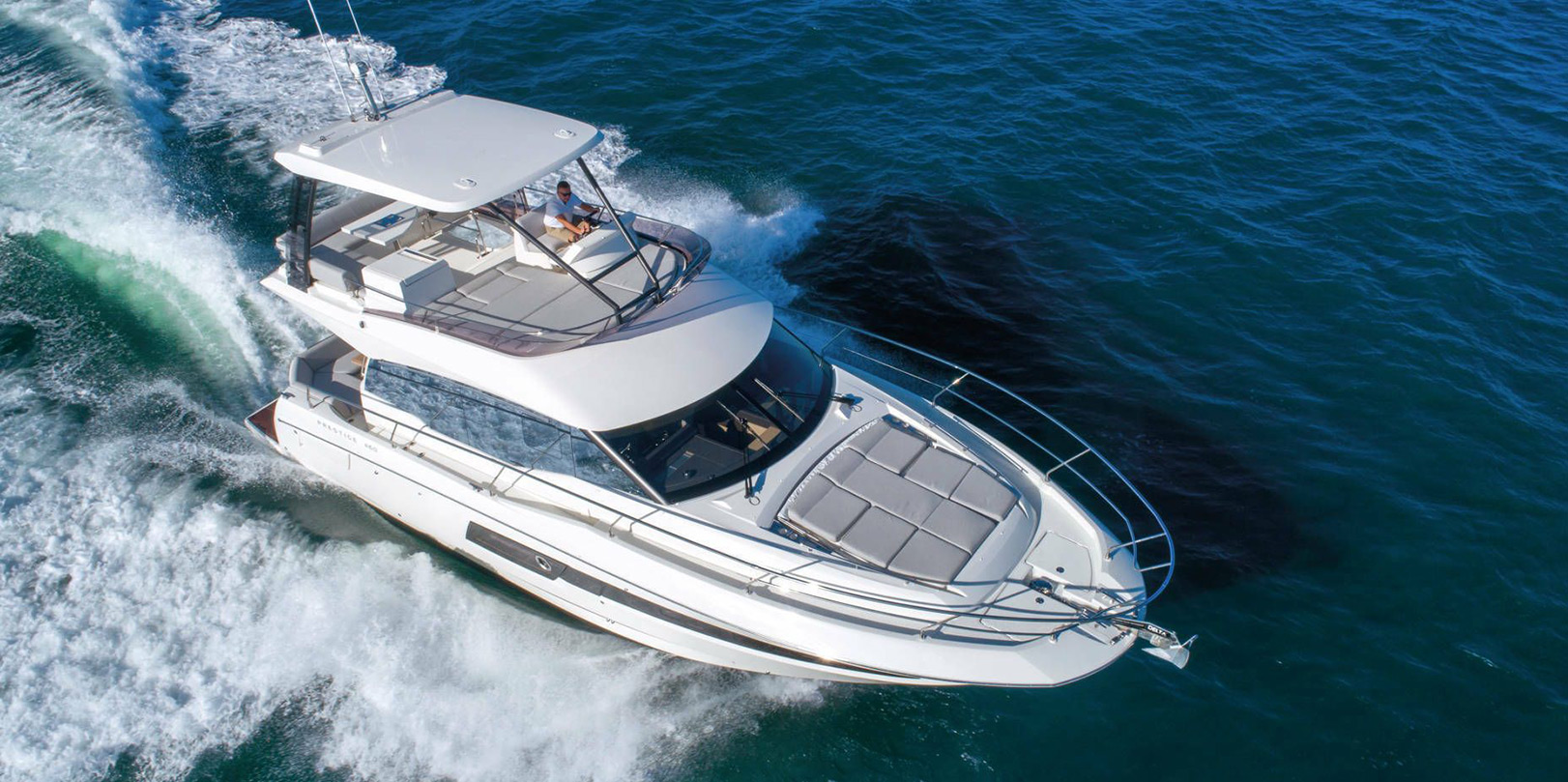 On the exterior, she features the signature style of the latest PRESTIGE Yachts, with an expanded, continuous line of windows in the hull. This Flybridge integrates the concept of the L-shaped cockpit, which allows for maximum use of space. Transformable into a very large aft sundeck, this cockpit can also house a fully equipped skipper cabin.