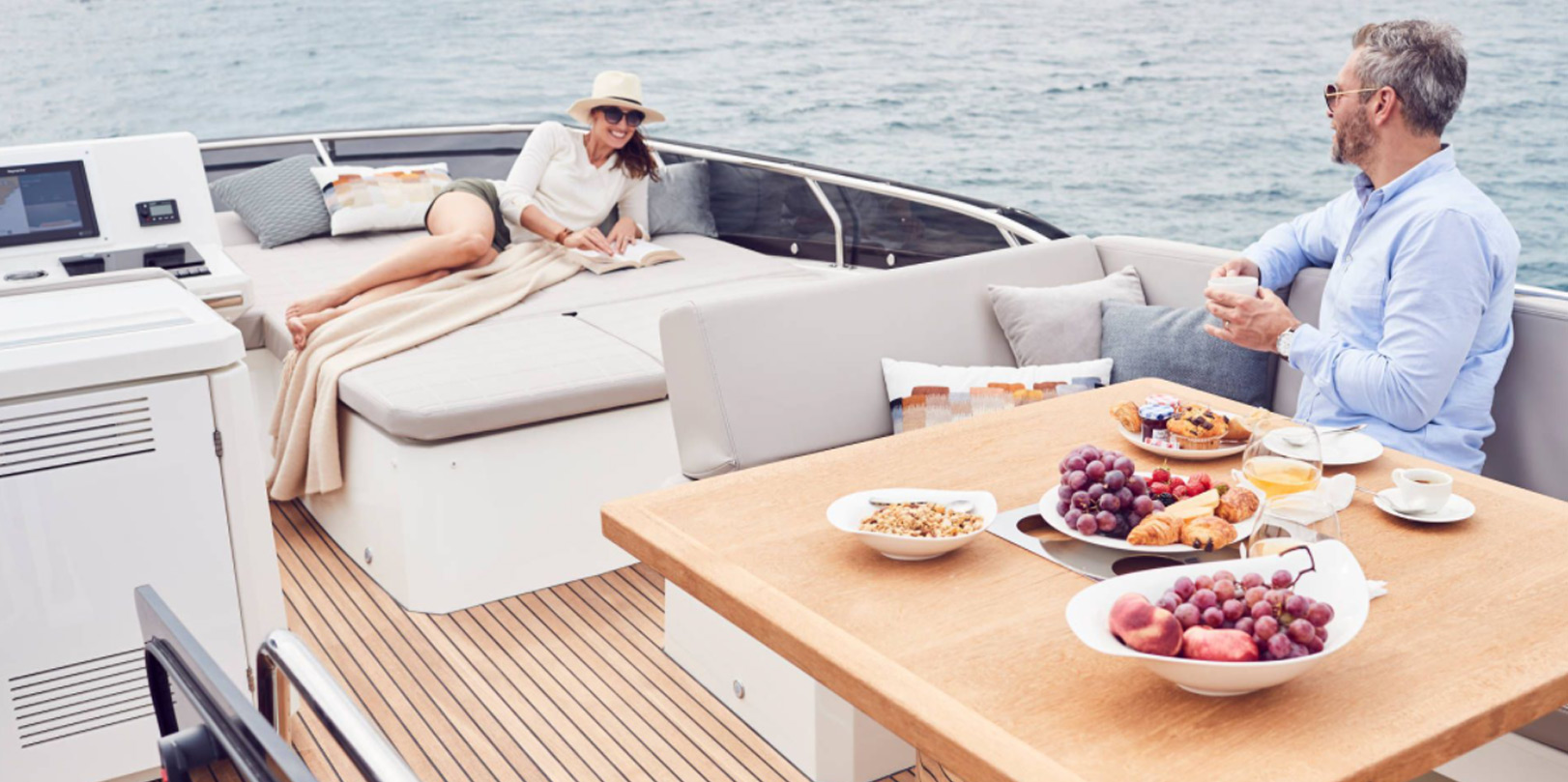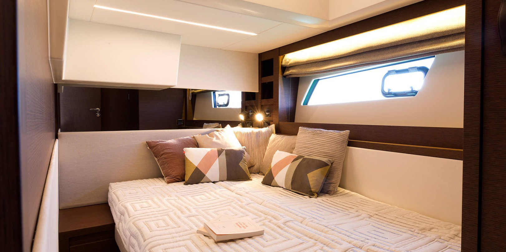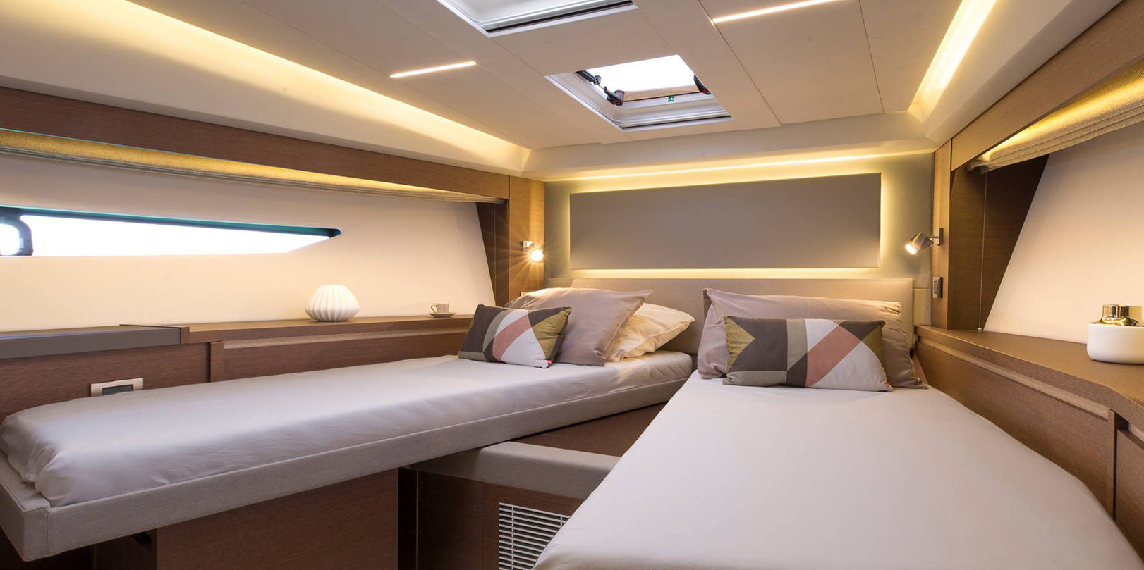 Life on board is easy, enhanced by numerous clever details. Conducive to relaxation, the L-shaped saloon includes an immense integrated storage locker. Intensely bright, the inviting saloon evokes a sense of well-being. Facing sofas and a modular cockpit bench seat, which can pivot to face the saloon, create the perfect space for entertaining.