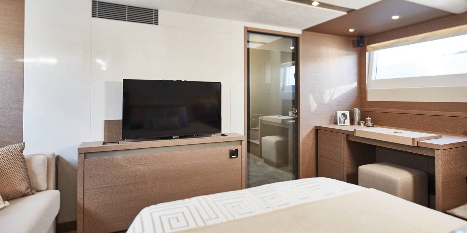 Perfectly integrated into the dynamic silhouette, the Sport Flybridge is composed of a full helm station, as well as a U-shaped saloon, which transforms into a sundeck, and a grill. All of the key concepts that make the PRESTIGE brand a success are present in this excellent motor yacht.