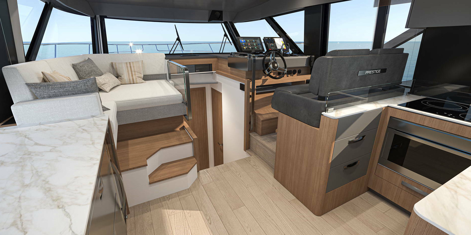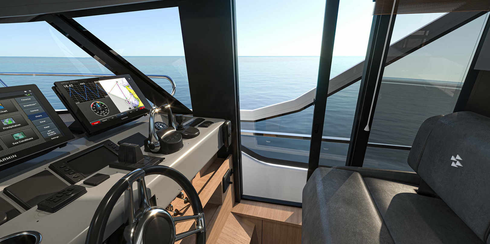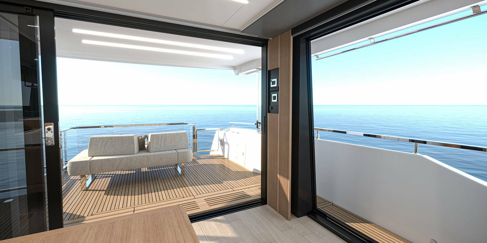 Designed for smooth, harmonious cruising, her design features a seamless connection with the sea. Entirely open, the “infinity cockpit” affords an incredible view of the ocean and easy access to the salon through a large electric sliding glass door.