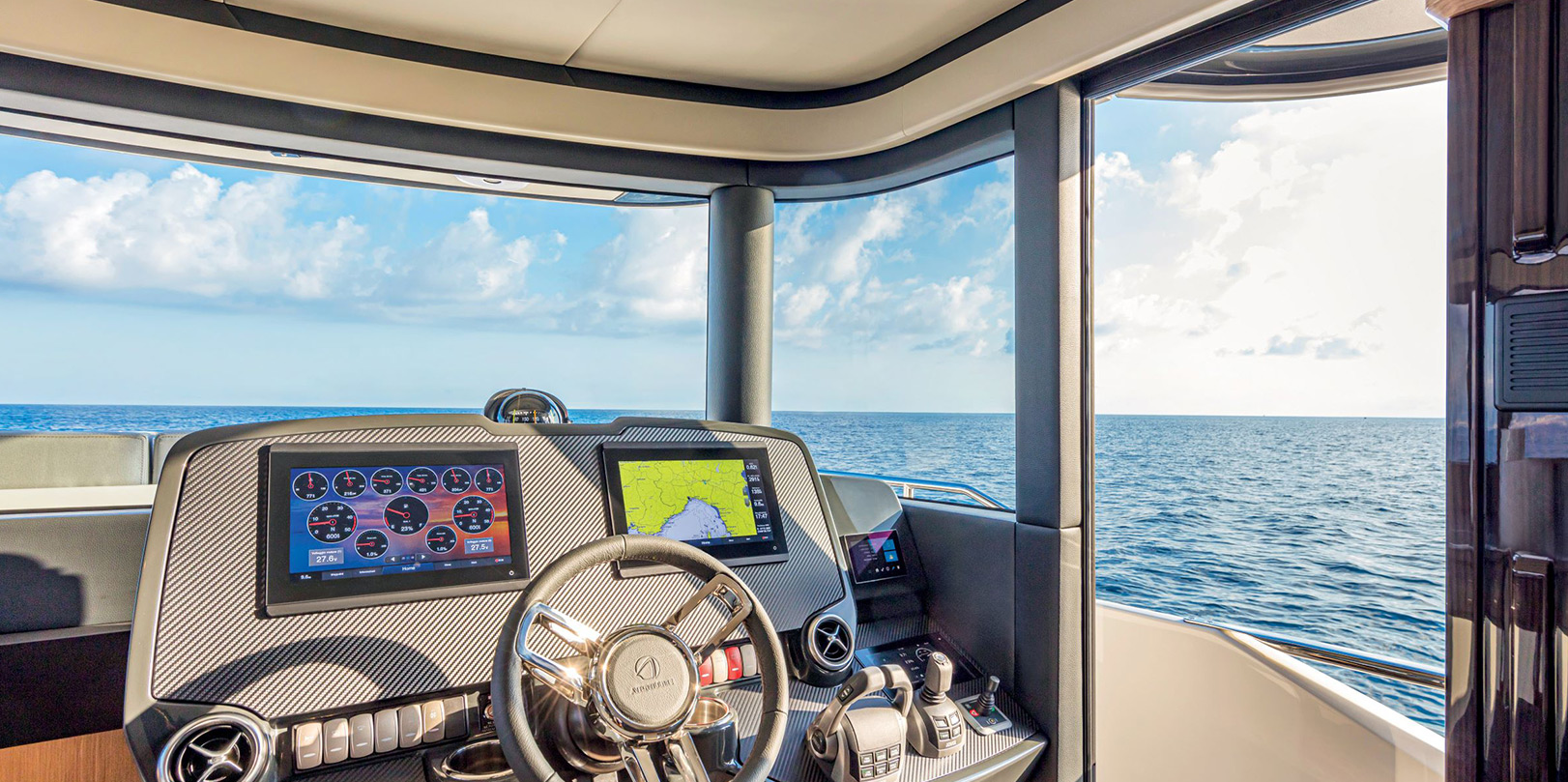 The helm station is modern and ergonomic, integrated with EmpirBus home automation technology, and equipped with a comfortable side door to ensure full autonomy of the shipowner, even during maneuvering operations.