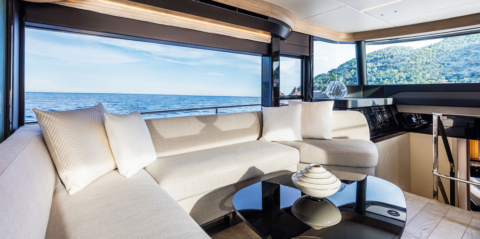 The helm station is ergonomic and has no central pillars on the windshield, ensuring unparalleled visibility whether standing or seated. The dashboard features EmpirBus home automation technology and can be equipped with two 17-inch GPS monitors with an access door to the side walkway to ease mooring operations.